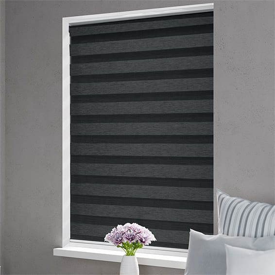 Μια πιο εναλλακτική υφή υφάσματος μαύρου ανθρακί σπασμένου με νερά, για μια πιο μοντέρνα εναλλακτική διακόσμηση με άποψη. Οι μαύρες ανθρακί λωρίδες του διπλού αυτού ρόλερ έχουν ένα πρωτοποριακό look δημιουργώντας γοητεία και χαρακτήρα, ενώ τα εναλλασσόμενα διάφανα τμήματα τους επιτρέπουν στο σπίτι σας να πλημμυρίσει με φως. Ένας  υπερ. σύγχρονος τρόπος διακόσμησης που μας δίνει την δυνατότητα να ρυθμίζουμε την φωτεινότητα του χώρου μας και την θερμοκρασία του. Κατάλληλα για γραφεία, βιτρίνες καταστημάτων, για να προστατεύουν από την ηλιακή ακτινοβολία χωρίς να εμποδίζουν την οπτική εικόνα προς το εσωτερικό περιβάλλον του γραφείου ή του καταστήματος. Το Βάρος του υφάσματος 138gr/m² και το Πάχος του είναι 0.40mm