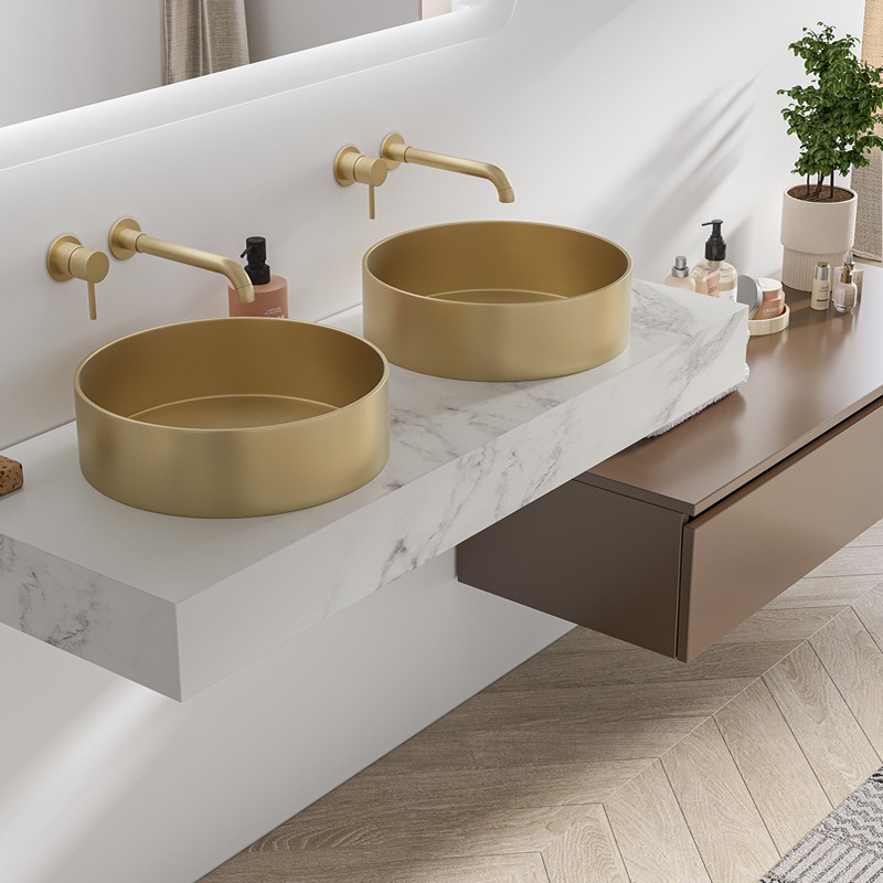 Επιτύχετε στο μπάνιο σας την απόλυτη σχεδιαστική κομψότητα με αυτήν την έτοιμη σύνθεση επίπλου. Αποτελείται από ένα έπιπλο κρεμαστό σε Καφέ απόχρωση που διαθέτει το κάθε ένα 1 συρτάρι με μεταλλικό σκελετό και σύστημα soft close έχοντας αρκετά μεγάλο αποθηκευτικό χώρο. Το υλικό της κατασκευής του είναι πράσινο ανθυγρό 18mm έχοντας τεράστια αντοχή σε νερά και υγρασίες ενώ έχει διαστάσεις 120cm (Μήκος) x 45cm (Προεξοχή από τον τοίχο) x 27cm (Ύψος), συνδυάζεται με μεγάλο ράφι σε Λευκή με Μαρμάρινα μοτίβα επιφάνεια από MDF επενδυμένο με ειδικό Thermofoil PVC με διάσταση 120x45x12cm.Υπάρχει η δυνατότητα επιπλέον επιλογής διπλού επικαθήμενου ανοξείδωτου στρογγυλού νιπτήρα με Χρυσό ματ φινίρισμα με επίστρωση PVD με διαστάσεις Φ.38cm ο οποίος δεν διαθέτει οπή για μπαταρία, Καθρέφτη με ψυχρό LED φωτισμό με διαστάσεις 120x80cm, καθώς και 2 ανοιχτά ράφια Καφέ φινιρίσματος με διαστάσεις 15x20x55cm.