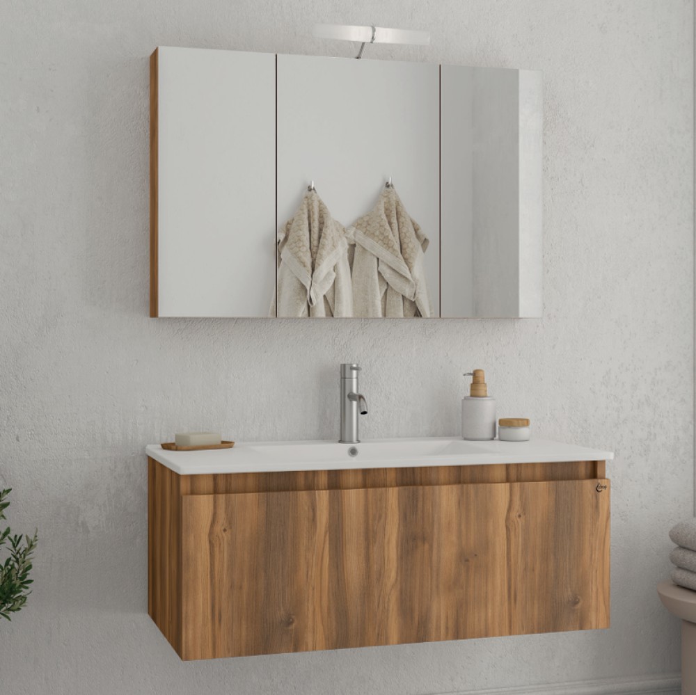 Ένα οικονομικό σετ το οποίο περιλαμβάνει 1 κρεμαστή βάση επίπλου με μια ανακλινόμενη πόρτα ενιαίο αποθηκευτικό χώρο με διαστάσεις  (100 × 45 × 35 cm) σε καφέ σκούρα απόχρωση ξύλου Amber Baroque Oak, κατασκευασμένο από απλή μελαμίνη, διαθέτει επίσης νιπτήρα από υλικό κατασκευής πορσελάνη με διαστάσεις  (102 × 47 × 19 cm) καθώς και καθρέφτη με 3 ντουλάπια για επιπλέον αποθηκευτικό χώρο με διαστάσεις  (89 × 12 × 57,5 cm).