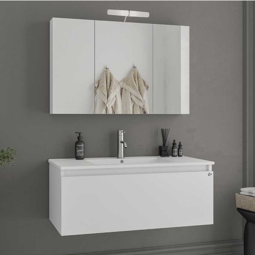 Ένα οικονομικό σετ το οποίο περιλαμβάνει 1 κρεμαστή βάση επίπλου με μια ανακλινόμενη πόρτα ενιαίο αποθηκευτικό χώρο με διαστάσεις  (100 × 45 × 35 cm) σε Λευκή απόχρωση, κατασκευασμένο από απλή μελαμίνη, διαθέτει επίσης νιπτήρα από υλικό κατασκευής πορσελάνη με διαστάσεις  (102 × 47 × 19 cm) καθώς και καθρέφτη με 3 ντουλάπια για επιπλέον αποθηκευτικό χώρο με διαστάσεις  (89 × 12 × 57,5 cm).