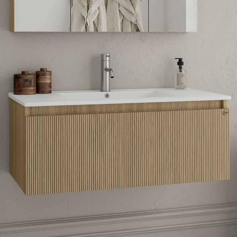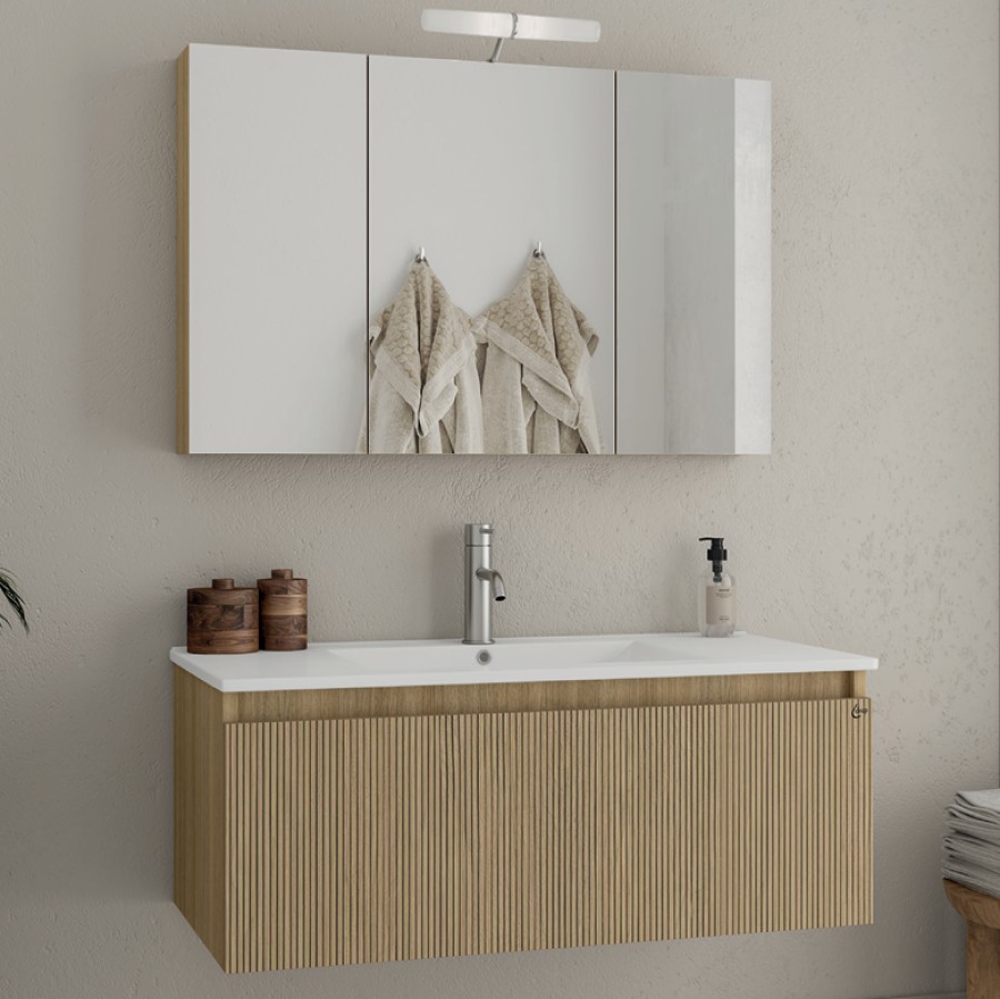 Ένα οικονομικό σετ το οποίο περιλαμβάνει 1 κρεμαστή βάση επίπλου με μια ανακλινόμενη πόρτα ενιαίο αποθηκευτικό χώρο με διαστάσεις  (100 × 45 × 35 cm) σε απόχρωση φυσικού ξύλου δρυς Slavonia Oak, κατασκευασμένο από απλή μελαμίνη, διαθέτει επίσης νιπτήρα από υλικό κατασκευής πορσελάνη με διαστάσεις  (102 × 47 × 19 cm) καθώς και καθρέφτη με 3 ντουλάπια για επιπλέον αποθηκευτικό χώρο με διαστάσεις  (89 × 12 × 57,5 cm).