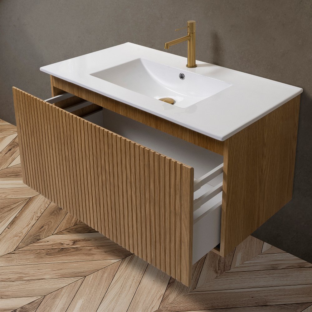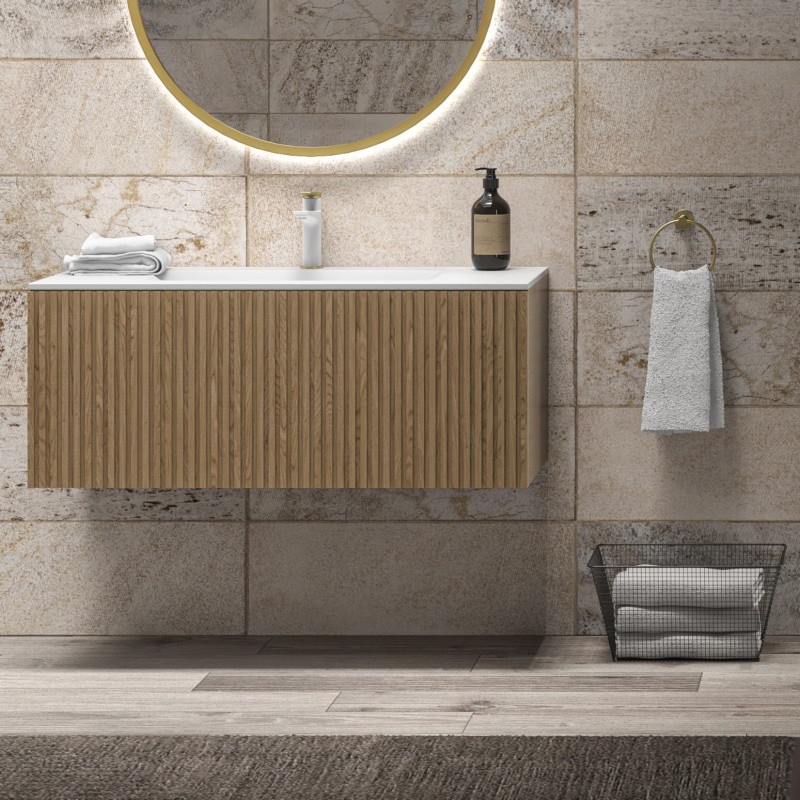 Ένα μοναδικής κατασκευής και κομψότητας κρεμαστό έπιπλο μπάνιου κατασκευασμένο από κόντρα πλακέ θαλάσσης στην φυσική απόχρωση του ξύλου δρυς. Εντυπωσιακή πρόσοψη στο συρτάρι που διαθέτει με ένα αρχιτεκτονικό μοτίβο ακρίβειας δημιουργώντας κάθετες επάλληλες γραμμές προσδίδοντας μοναδική αισθητική στον χώρο. Το έπιπλο διαθέτει 1 συρτάρι με μηχανισμό push to open καθώς και 1 corian νιπτήρα με λευκό ματ φινίρισμα και μέγιστη αντοχή. Το έπιπλο έχει διαστάσεις 79cm (Πλάτος) x 45.5cm (Προεξοχή από τον τοίχο) x 40cm (Ύψος) και Ο νιπτήρας που διαθέτει έχει διαστάσεις 80.5cm (Πλάτος) x 46.5cm (Προεξοχή από τον τοίχο). Ο καθρέφτης δεν περιλαμβάνεται στην τιμή!!!!