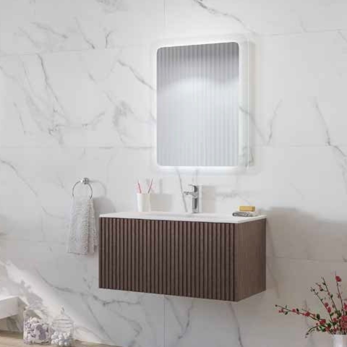 Ένα μοναδικής κατασκευής και κομψότητας κρεμαστό έπιπλο μπάνιου κατασκευασμένο από κόντρα πλακέ θαλάσσης σε καφέ σκούρα απόχρωση ξύλου. Εντυπωσιακή πρόσοψη στο συρτάρι που διαθέτει με ένα αρχιτεκτονικό μοτίβο ακρίβειας δημιουργώντας κάθετες επάλληλες γραμμές προσδίδοντας μοναδική αισθητική στον χώρο. Το έπιπλο διαθέτει 1 συρτάρι με μηχανισμό push to open καθώς και 1 corian νιπτήρα με λευκό ματ φινίρισμα και μέγιστη αντοχή. Το έπιπλο έχει διαστάσεις 79cm (Πλάτος) x 45.5cm (Προεξοχή από τον τοίχο) x 40cm (Ύψος) και Ο νιπτήρας που διαθέτει έχει διαστάσεις 80.5cm (Πλάτος) x 46.5cm (Προεξοχή από τον τοίχο). Ο καθρέφτης δεν περιλαμβάνεται στην τιμή!!!!