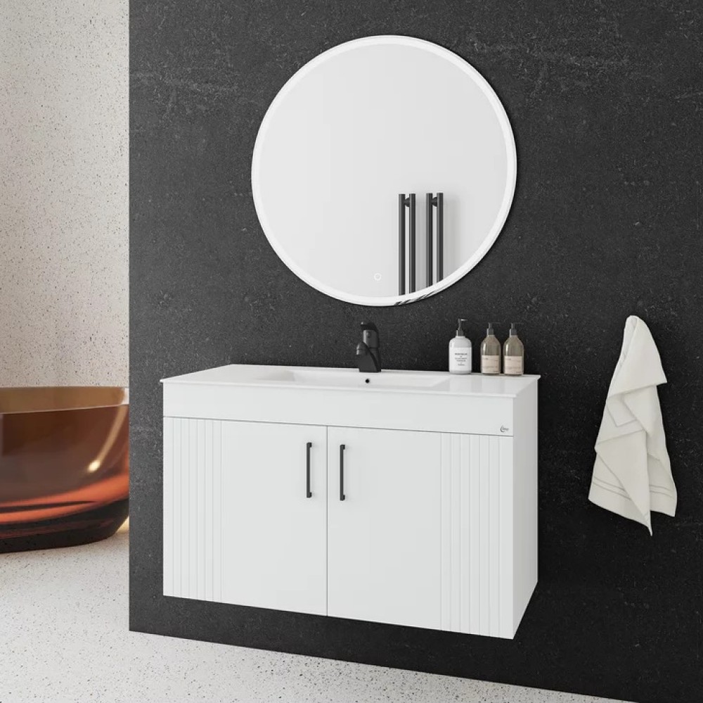 Μοναδικό εντυπωσιακό έπιπλο σε λευκό ματ φινίρισμα με 2 ντουλάπια με ιδιαίτερη αυλακωτή λεπτομέρεια στην άκρη του ντουλαπιού για ένα απαράμιλλο design.Ένα έπιπλο που προσελκύει τα βλέμματα με τις κομψές γραμμές του αποπνέοντας πολυτέλεια και κομψότητα. Η βάση του επίπλου διαθέτει 2 ανοιγόμενες πόρτες ντουλάπια με μεγάλο αποθηκευτικό χώρο και έχει διαστάσεις 80cm (πλάτος) x 45cm (προβολή από τον τοίχο) x 50cm (ύψος) και συνδυάζεται με κεραμικό νιπτήρα με λευκό γυαλιστερό φινίρισμα και διαστάσεις 81x46x19cm.Προτείνεται να συνδυαστεί για επιπλέον αποθηκευτικό χώρο με Κρεμαστή Στήλη με 2 ανοιγόμενες πόρτες με διαστάσεις 30cm(πλάτος) x26cm (προβολή από τοίχο) x120cm (ύψος).Δυνατότητα επιλογής και Καθρέφτη για την δημιουργία του απόλυτου Σετ και κουμπί αφής και με περιμετρικό φωτισμό LED με διάσταση 60x80cm.
