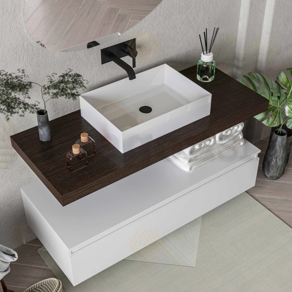 Επιτύχετε στο μπάνιο σας την απόλυτη σχεδιαστική κομψότητα με αυτήν την έτοιμη σύνθεση επίπλου. Αποτελείται από ένα έπιπλο κρεμαστό σε Λευκή Γυαλιστερή απόχρωση που διαθέτει το κάθε ένα 1 συρτάρι με μεταλλικό σκελετό και σύστημα soft close έχοντας αρκετά μεγάλο αποθηκευτικό χώρο. Το υλικό της κατασκευής του είναι πράσινο ανθυγρό 18mm έχοντας τεράστια αντοχή σε νερά και υγρασίες ενώ διατίθεται σε έχει 4 διαστάσεις 80cm ή 100cm ή 120cm ή 140cm (Μήκος) x 45cm (Προεξοχή από τον τοίχο) x 27cm (Ύψος), συνδυάζεται με μεγάλο ράφι σε καφέ ξύλινη επιφάνεια από MDF επενδυμένο με ειδικό Thermofoil PVC με διάσταση 80 ή 100cm ή 120cm ή 140cm (Μήκος) x45cm  (Προεξοχή από τον τοίχο) x12cm (Πάχος) . Στην επιλογή που θα κάνετε πάντα το έπιπλο θα έχει την ίδια διάσταση με την ξύλινη επιφάνεια.  Η τιμή δεν περιλαμβάνει τους νιπτήρες, τις μπαταρίες, τους καθρέφτες και τα υπόλοιπα αξεσουάρ.