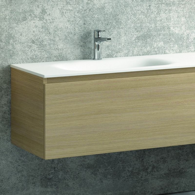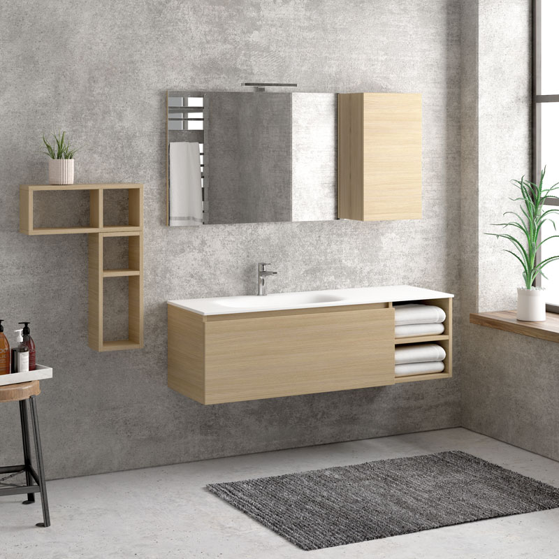 Ένα μοντέρνο κρεμαστό έπιπλο μπάνιου κατασκευασμένο στην απόχρωση του Φυσικού Ξύλου με Λευκό Ματ νιπτήρα (solid surface) . Ένα προϊόν με τεράστια αντοχή στις υγρασίες και στα νερά από υλικό κατασκευής πράσινο άνθυγρο MDF υδατοαπωθητικό 18mm. Διαθέτει 2 ανοιχτά ράφια & 1 συρτάρι με μεταλλικό σκελετό και σύστημα soft close με μεγάλο αποθηκευτικό χώρο ενώ έχει διαστάσεις 135cm (Πλάτος) x 40cm (Προβολή από τον τοίχο) x 46.5cm (Ύψος).Στην φωτογραφία συνδυάζεται με νιπτήρα λευκού ματ φινιρίσματος με διαστάσεις 135x46x16cm ο οποίος δεν διαθέτει οπή για μπαταρία, 2 ράφια πλαϊνά με διαστάσεις το καθένα (15x20x55cm) καθώς και ένα καθρέφτη με 1 ντουλάπι με ολικές διαστάσεις 135x13x75cm.
