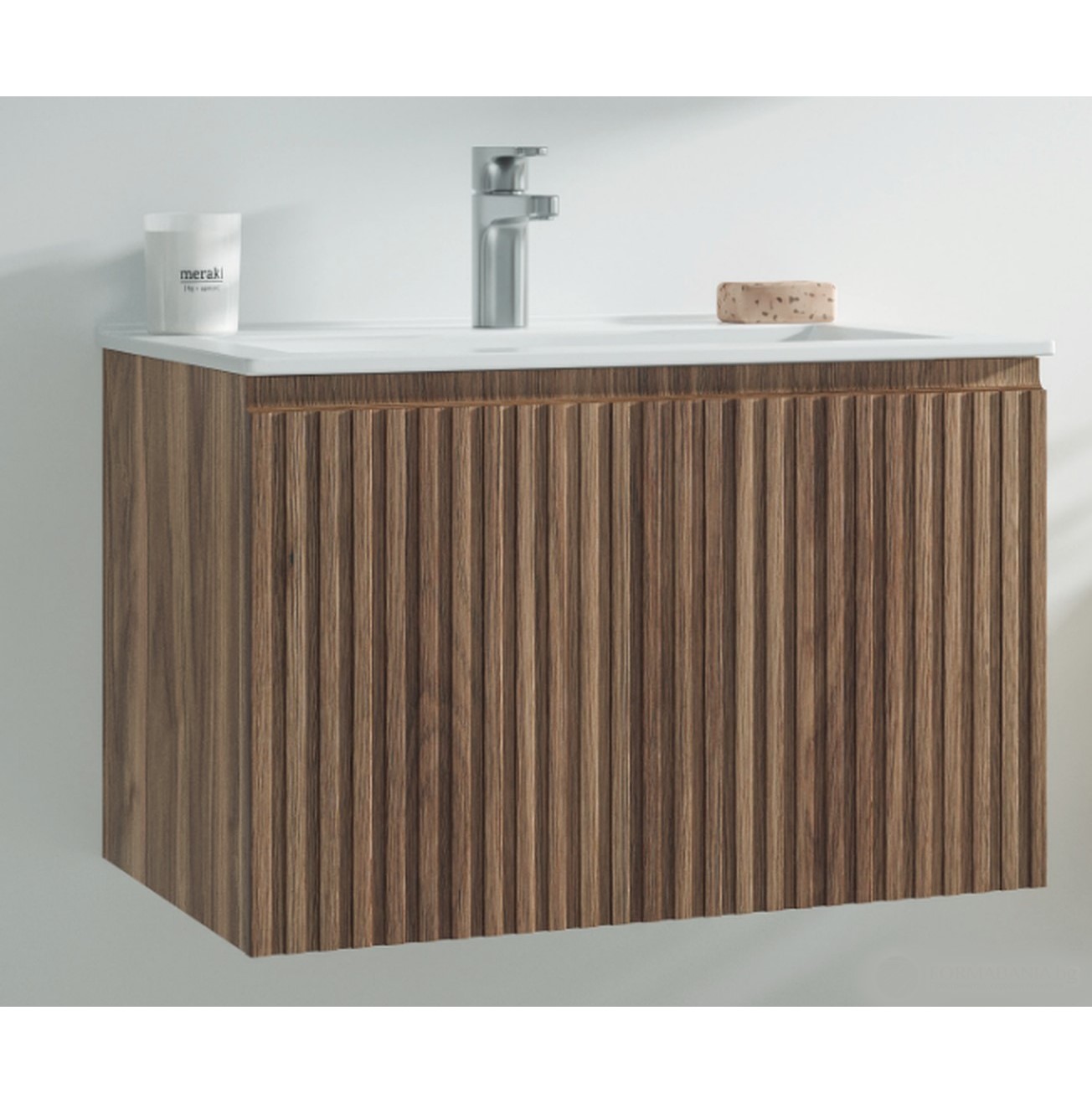 Ένα εντυπωσιακό έπιπλο μπάνιου σε φινίρισμα ξύλου Charleston συνδυαζόμενο με Νιπτήρα πορσελάνης Λευκού Γυαλιστερού φινιρίσματος και μοναδικό γραμμωτό επαναλαμβανόμενο μοτίβο ακρίβειας στην πρόσοψή του. Διαθέτει 1 συρτάρι ενώ κατασκευάζεται από πράσινο ανθυγρό υλικό επενδυμένο με Thermfoil PVC για να γίνει εξαιρετικά ανθεκτικό στο νερό και την υγρασία. Η διάσταση της βάσης του επίπλου είναι 99cm (Πλάτος) x 45.5cm (Προβολή από τον τοίχο) x 45cm (Ύψος) ενώ η νιπτήρας έχει διαστάσεις 101x47x18cm