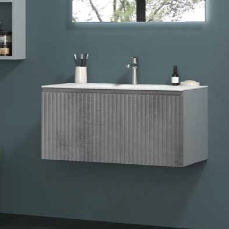 Ένα εντυπωσιακό έπιπλο μπάνιου σε φινίρισμα γκρι τσιμέντου συνδυαζόμενο με Νιπτήρα πορσελάνης Λευκού Γυαλιστερού φινιρίσματος και μοναδικό γραμμωτό επαναλαμβανόμενο μοτίβο ακρίβειας στην πρόσοψή του. Διαθέτει 1 συρτάρι ενώ κατασκευάζεται από πράσινο ανθυγρό υλικό εξαιρετικά ανθεκτικό στο νερό και την υγρασία. Στην τιμή δεν περιλαμβάνεται ο καθρέφτης, η μπαταρία, τα φωτιστικά και τα αξεσουάρ.
