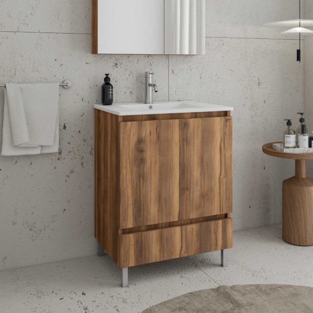 Έπιπλο μπάνιου για επιδαπέδια στήριξη με 4 βάσεις το οποίο διαθέτει 2 ντουλάπια & 1 συρτάρι σε καφέ σκούρα επιφάνεια ξύλου Amber Baroque Oak με διαστάσεις (75 × 45 × 80 cm) και νιπτήρα πορσελάνης λευκού γυαλιστερού φινιρίσματος με διαστάσεις (77 × 47 × 19 cm).