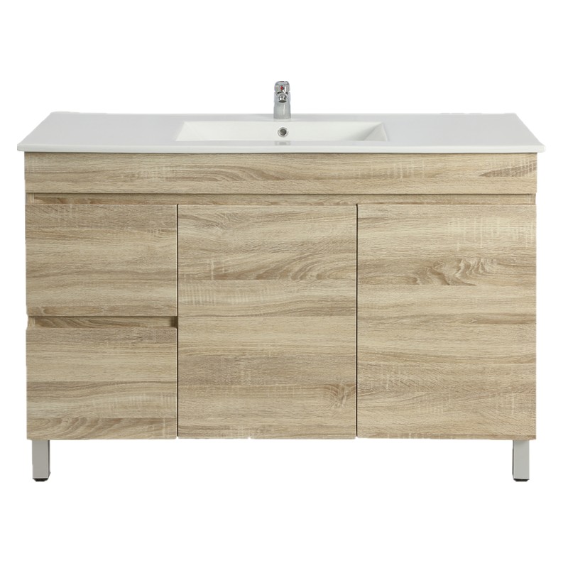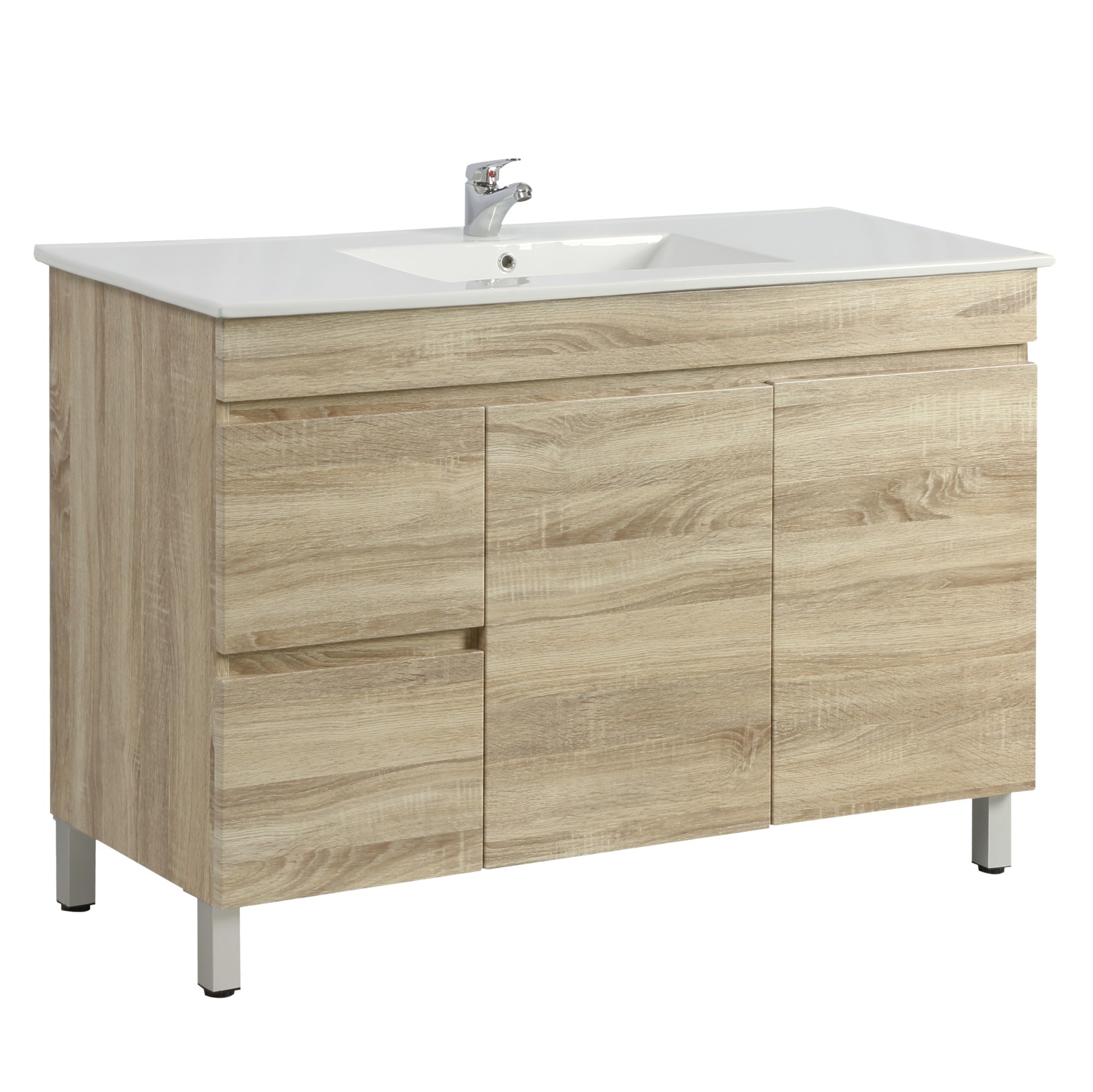 Ένα μοντέρνο κρεμαστό έπιπλο μπάνιου κατασκευασμένο στην φυσική απόχρωση ξύλου Δρυς με Λευκό Γυαλιστερό νιπτήρα πορσελάνης. Ένα προϊόν με τεράστια αντοχή στις υγρασίες και στα νερά από υλικό κατασκευής πράσινο άνθυγρο υδατοαπωθητικό 18mm. Διαθέτει 2 ντουλάπια καθώς και 2 μικρά συρτάρια με μεταλλικό σκελετό και σύστημα soft close με μεγάλο αποθηκευτικό χώρο ενώ έχει διαστάσεις 99cm (Πλάτος) x 45.5cm (Προβολή από τον τοίχο) x 63cm (Ύψος).Συνδυάζεται με λευκό γυαλιστερό νιπτήρα από 100% άριστης ποιότητας πορσελάνη με διαστάσεις 101x47x18cm που διαθέτει οπή για μπαταρία πάνω στον νιπτήρα. Διαθέτει 4 βάσεις για στήριξη στο δάπεδο.
