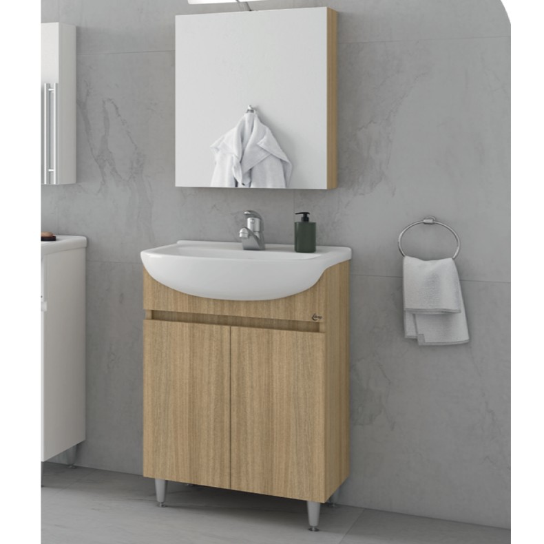 Έπιπλο για επιδαπέδια στήριξη διαστάσεων 50cm (πλάτος) x 39cm(προεξοχή από τον τοίχο) x 80(ύψος) με 2 ανοιγόμενες πόρτες και ενιαίο αποθηκευτικό χώρο σε Slavonia Oak φινίρισμα. Διαθέτει νιπτήρα πορσελάνης άριστης ποιότητας κυλινδρικού σχεδιασμού σε λευκό γυαλιστερό φινίρισμα με διαστάσεις (50x39x17.5cm) καθώς και καθρέφτη με 2 πόρτες και αποθηκευτικό χώρο με διαστάσεις (40x12x68cm).Μοντέρνα και διαχρονική επιλογή που ταιριάζει μοναδικά σε κάθε μπάνιο. **Προσοχή το φωτιστικό δεν συμπεριλαμβάνεται**