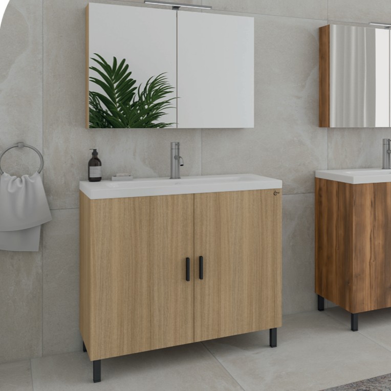 Επιδαπέδια βάση επίπλου διαστάσεων 80cm (πλάτος) x 80cm ( ύψος) x 39cm(προεξοχή από τον τοίχο) με 2 πόρτες και ενιαίο αποθηκευτικό χώρο σε Slavonia Oak φινίρισμα. Διαθέτει νιπτήρα πορσελάνης άριστης τετράγωνου σχεδιασμού σε λευκό γυαλιστερό φινίρισμα με διαστάσεις (80x39cm) καθώς και καθρέφτη ντουλάπι με 3 πόρτες με διαστάσεις (75.5x57.5x12cm).Μοντέρνα και διαχρονική επιλογή που ταιριάζει μοναδικά σε κάθε μπάνιο.