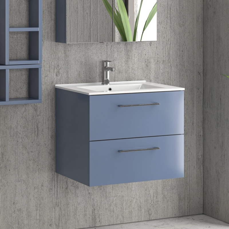 Κρεμαστό έπιπλο βάσης κατασκευασμένο από άριστης ποιότητας πράσινο ανθυγρό σε μια μοντέρνα Μπλε απόχρωση με σκοπό να δώσει ένταση και προσωπικότητα σε κάθε μπάνιο που τοποθετηθεί. Διαθέτει το έπιπλο διαστάσεων (59.5x45.5x48cm) με 2 συρτάρια soft-close κλεισίματος, ενώ συνδυάζεται με νιπτήρα πορσελάνης σε λευκή γυαλιστερή απόχρωση με διαστάσεις 60x47x18cm ενώ υπάρχει η δυνατότητα επιλογής να συνδυαστεί με καθρέφτη με ντουλάπι για επιπλέον αποθηκευτικό χώρο με διαστάσεις 60x13x75cm και με 2 ανοιχτά ράφια με διαστάσεις 75x13x60cm.