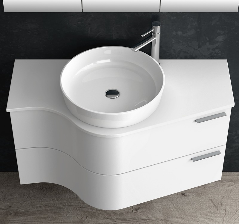Ένα επιβλητικού ιδιαίτερου σχεδιασμού κρεμαστό έπιπλο μπάνιου κατασκευασμένο σε μια καθαρή Λευκή Γυαλιστερή Λάκα με Λευκή Ματ επιφάνεια για την τοποθέτηση επικαθήμενου νιπτήρα . Ένα προϊόν με τεράστια αντοχή στις υγρασίες και στα νερά από υλικό κατασκευής πράσινο άνθυγρο MDF υδατοαπωθητικό 18mm. Διαθέτει 2 συρτάρια με μεταλλικό σκελετό και σύστημα soft close με μεγάλο αποθηκευτικό χώρο ενώ έχει διαστάσεις 100cm (Πλάτος) x 36cm (Προβολή από τον τοίχο) x 50cm (Ύψος).Στην φωτογραφία συνδυάζεται με επικαθήμενο στρογγυλό νιπτήρα διπλής επισμάλτωσης λευκού φινιρίσματος με διαστάσεις Φ.48cm ο οποίος δεν διαθέτει οπή για μπαταρία, καθώς και με καθρέφτη 3 ντουλάπια με διαστάσεις 100x75x13cm για επιπλέον αποθηκευτικό χώρο. Καθώς και με 2 Στήλες με 4 εσωτερικά ράφια και διαστάσεις η κάθε μια 35x27x160cm