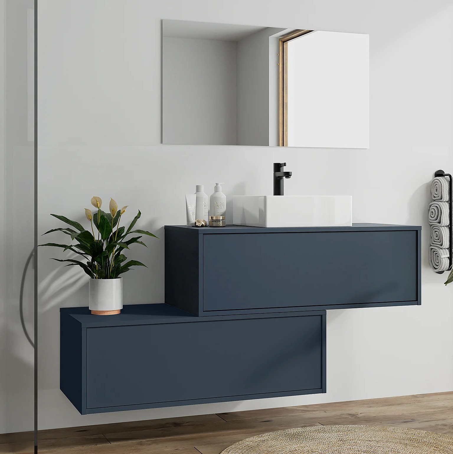 Ένα μοντέρνο κρεμαστό έπιπλο μπάνιου κατασκευασμένο από άριστης ποιότητας Λάκα σε καθηλωτική Μπλε απόχρωση. Ένα προϊόν με τεράστια αντοχή στις υγρασίες και στα νερά από υλικό κατασκευής λάκα υδατοαπωθητική 18mm. Διαθέτει δύο βάσεις επίπλου που η κάθε μια διαθέτει 1 συρτάρι με μεταλλικό σκελετό και σύστημα soft close με μεγάλο αποθηκευτικό χώρο ενώ έχει διαστάσεις 80cm ή 100cm (Πλάτος) x 46.5cm (Προβολή από τον τοίχο) x 35cm (Ύψος).Οι 2 βάσεις του επίπλου είναι συσκευασμένες ξεχωριστά και στην φωτογραφία έχουμε μια πρόταση διακόσμησης που η μια βάση με την άλλη ρυθμίζονται κατά την τοποθέτηση