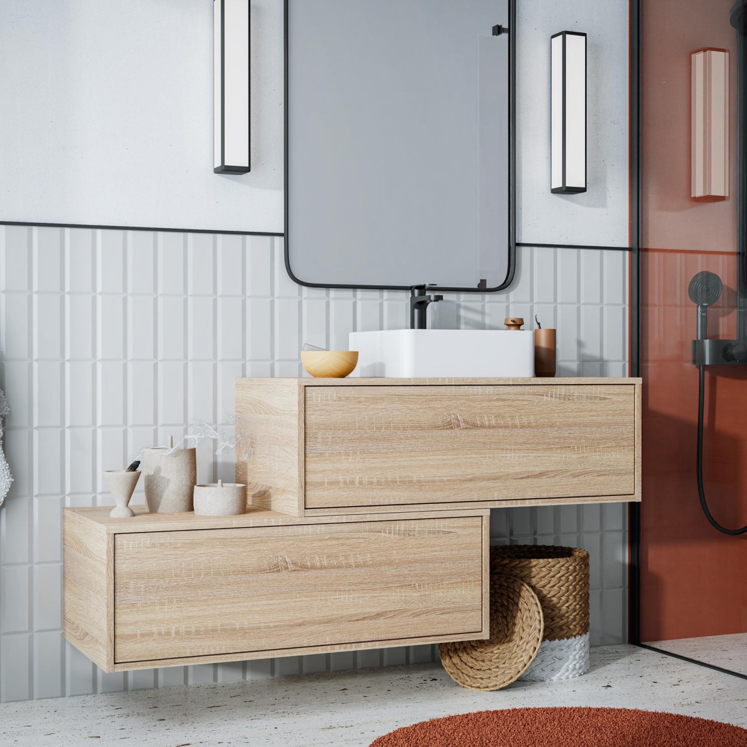 Ένα μοντέρνο κρεμαστό έπιπλο μπάνιου κατασκευασμένο με χρώμα ανοιχτόχρωμου Φυσικού Ξύλου. Ένα προϊόν με τεράστια αντοχή στις υγρασίες και στα νερά από υλικό κατασκευής πράσινο άνθυγρο MDF υδατοαπωθητικό 18mm. Διαθέτει δύο βάσεις επίπλου που η κάθε μια διαθέτει 1 συρτάρι με μεταλλικό σκελετό και σύστημα soft close με μεγάλο αποθηκευτικό χώρο ενώ έχει διαστάσεις 80cm (Πλάτος) x 46.5cm (Προβολή από τον τοίχο) x 35cm (Ύψος).Οι 2 βάσεις του επίπλου είναι συσκευασμένες ξεχωριστά και στην φωτογραφία έχουμε μια πρόταση διακόσμησης που η μια βάση με την άλλη ρυθμίζονται κατά την τοποθέτηση, συνδυάζεται με επικαθήμενο νιπτήρα διπλής επισμάλτωσης λευκού γυαλιστερού φινιρίσματος με διαστάσεις 38.5x38.5cm.