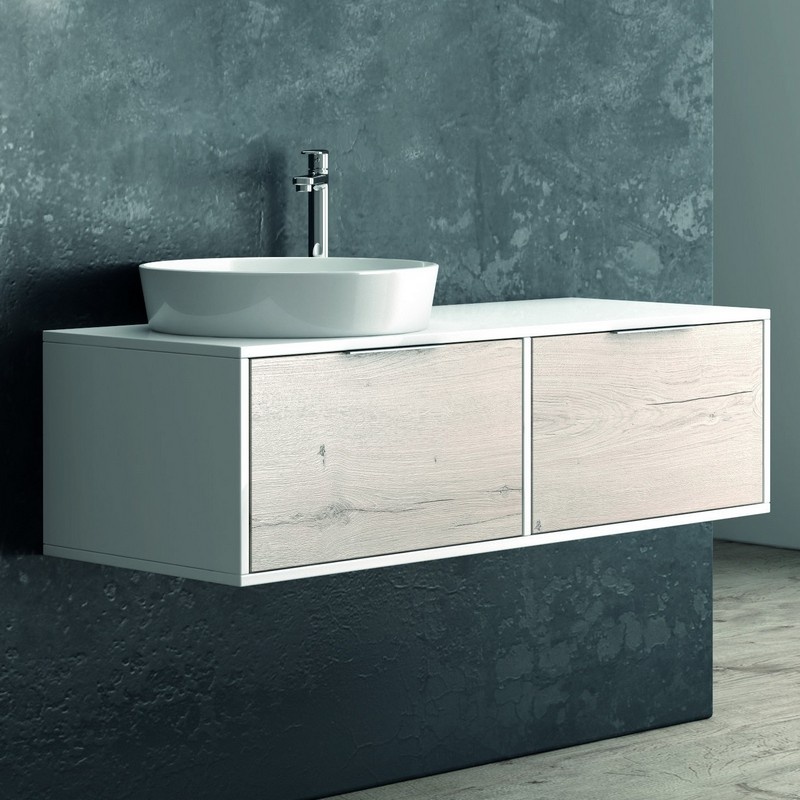 Ένα μοντέρνο κρεμαστό έπιπλο μπάνιου κατασκευασμένο σε μια μοναδική διχρωμία Λευκής Γυαλιστερής Λάκας περιμετρικά με Γκρι Τσιμεντί πρόσοψη. Ένα προϊόν με τεράστια αντοχή στις υγρασίες και στα νερά από υλικό κατασκευής πράσινο άνθυγρο MDF υδατοαπωθητικό 18mm. Διαθέτει 2 συρτάρια με μεταλλικό σκελετό και σύστημα soft close με μεγάλο αποθηκευτικό χώρο ενώ έχει διαστάσεις 120cm (Πλάτος) x 46.5cm (Προβολή από τον τοίχο) x 35cm (Ύψος).Στην φωτογραφία συνδυάζεται με επικαθήμενο νιπτήρα με φινίρισμα λευκό γυαλιστερό με διαστάσεις Φ.40cm ο οποίος δεν διαθέτει οπή για μπαταρία, καθώς και με καθρέφτη με φωτισμό Led με διαστάσεις 80x60cm.