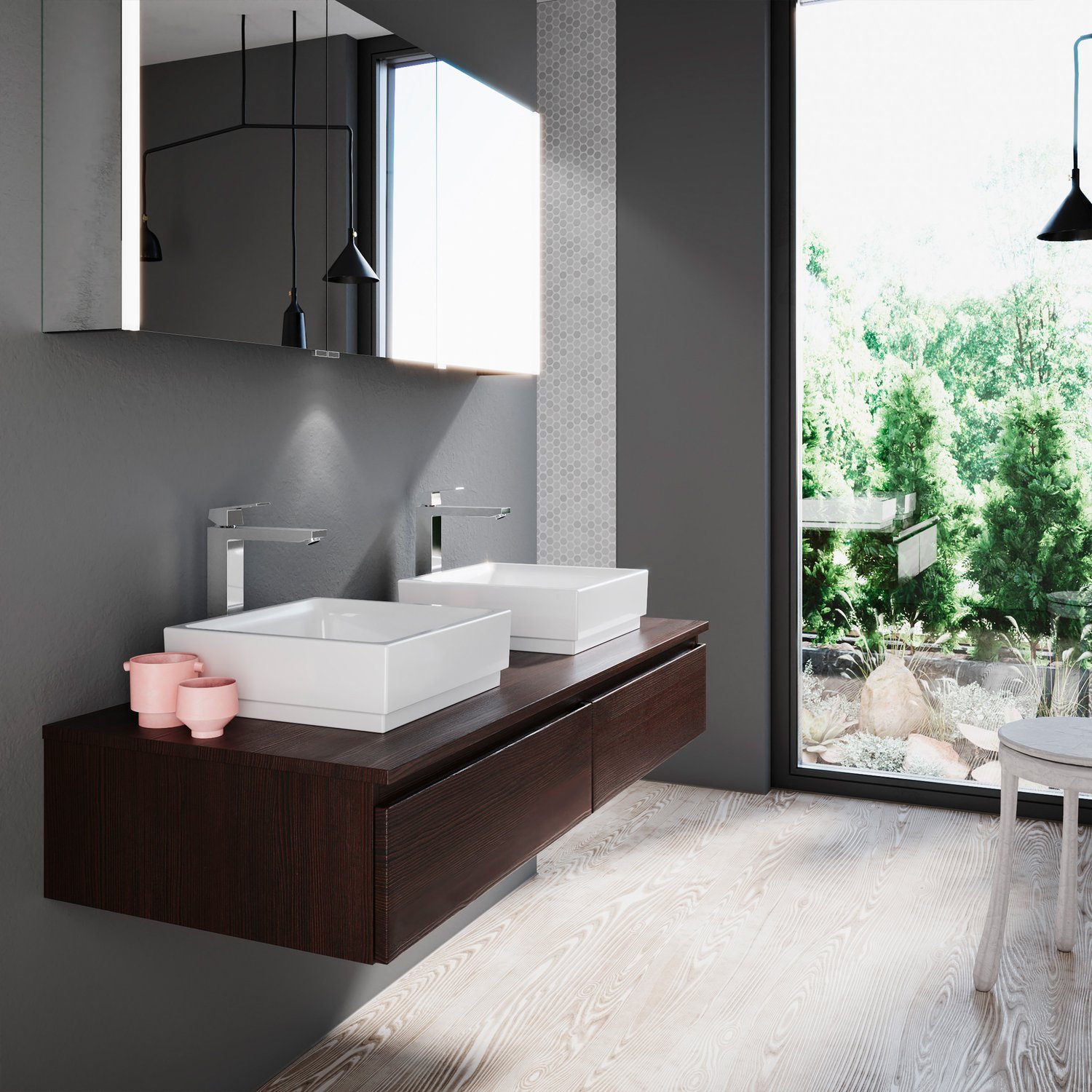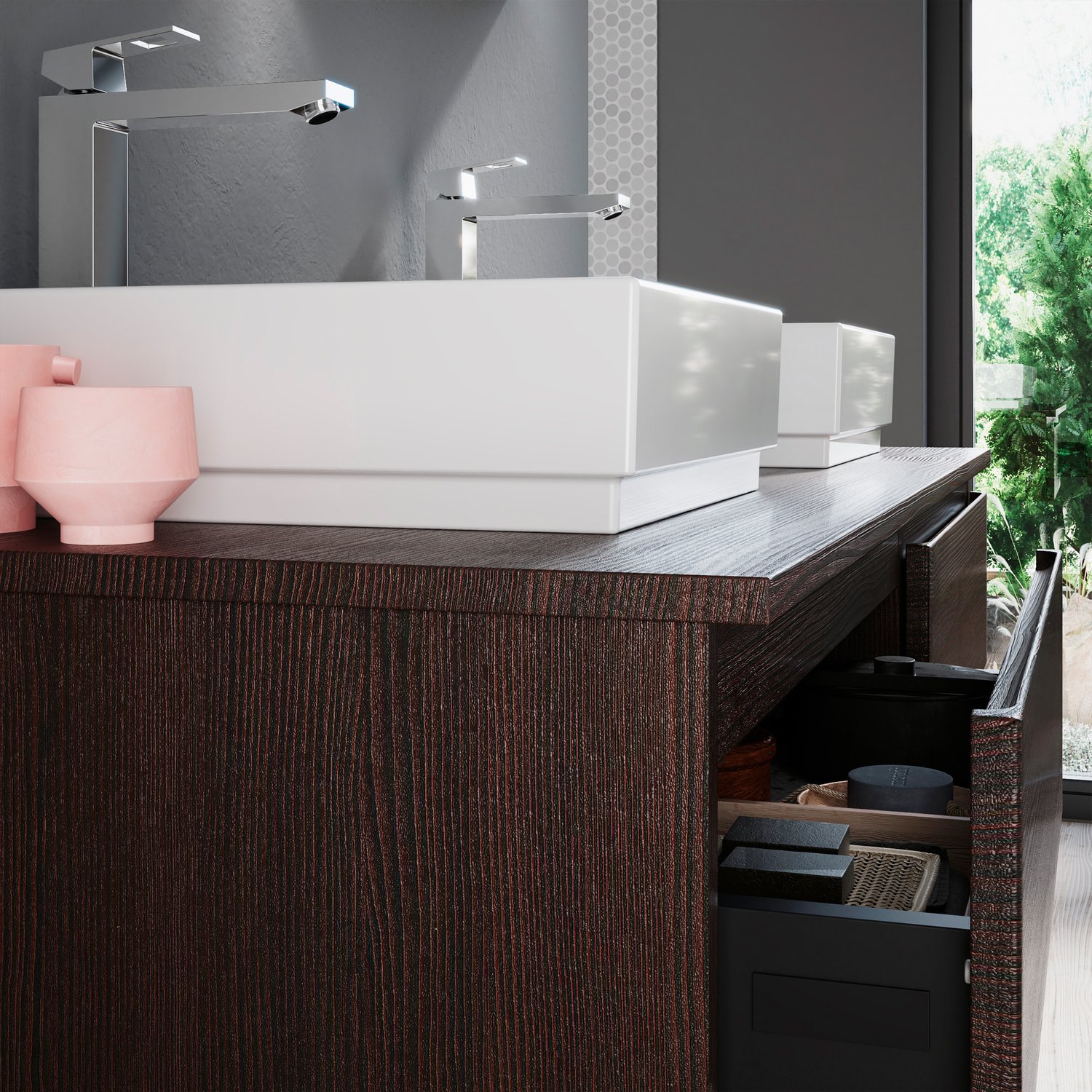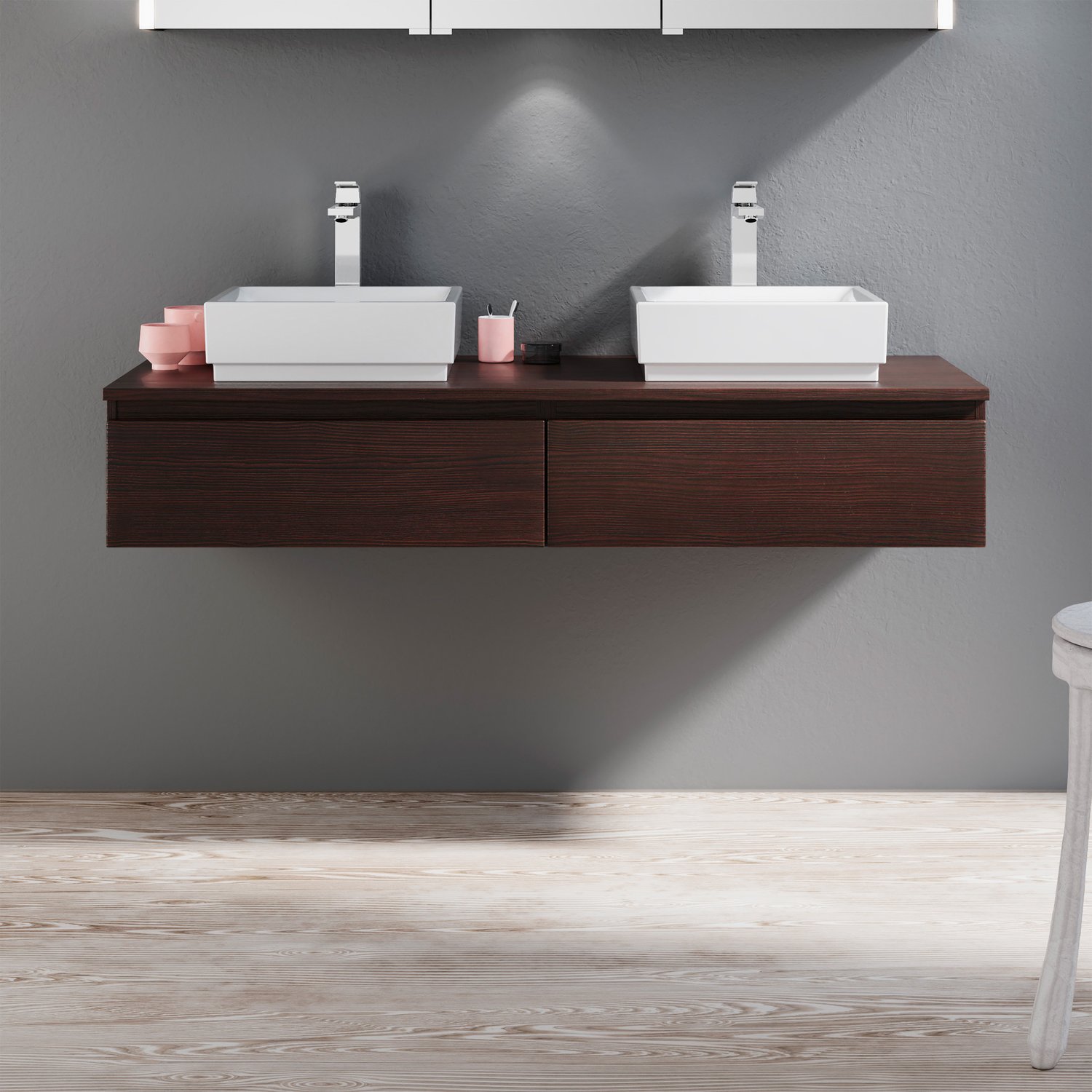 Μια εντυπωσιακή βάση επίπλου σε ένα έντονο πληθωρικό Μαύρο Καφέ σκουρόχρωμο φινίρισμα με έντονα ''νερά'' του ξύλου. Ένα προϊόν με τεράστια αντοχή στις υγρασίες και στα νερά από υλικό κατασκευής πράσινο άνθυγρο υδατοαπωθητικό 18mm. Διαθέτει 2 συρτάρια με μεταλλικό σκελετό και σύστημα soft close με μεγάλο αποθηκευτικό χώρο ενώ έχει διαστάσεις 155cm (Πλάτος) x 45cm (Προβολή από τον τοίχο) x 45cm (Ύψος). Συνδυάζεται ιδανικά με επικαθήμενους νιπτήρες της επιλογής σας. Προσοχή η τιμή δεν περιλαμβάνει τους νιπτήρες, τον καθρέφτη τις μπαταρίες και τα υπόλοιπα αξεσουάρ, η τιμή αναφέρεται στην βάση του επίπλου με τα 2 συρτάρια και τον πάγκο