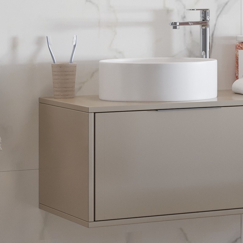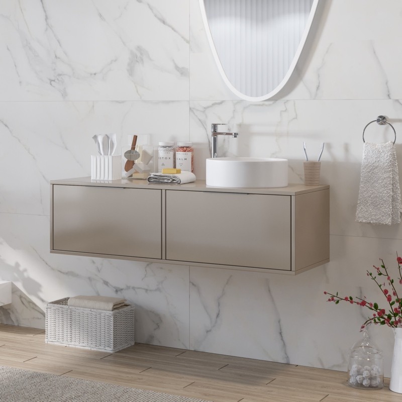 Ένα μοντέρνο κρεμαστό έπιπλο μπάνιου κατασκευασμένο σε Καφέ Μπεζ απόχρωση σαν την βρεγμένη ''άμμο''. Ένα προϊόν με τεράστια αντοχή στις υγρασίες και στα νερά από υλικό κατασκευής πράσινο άνθυγρο MDF υδατοαπωθητικό 18mm. Διαθέτει 2 συρτάρια με μεταλλικό σκελετό και σύστημα soft close με μεγάλο αποθηκευτικό χώρο ενώ έχει διαστάσεις 120cm (Πλάτος) x 46.5cm (Προβολή από τον τοίχο) x 35cm (Ύψος).Στην φωτογραφία συνδυάζεται με επικαθήμενο νιπτήρα διπλής επισμάλτωσης λευκού φινιρίσματος με διαστάσεις Φ.40cm ο οποίος δεν διαθέτει οπή για μπαταρία, καθώς και με έναν ιδιαίτερο καθρέφτη σε σχήμα βότσαλο με φωτισμό Led με διαστάσεις 100x65cm.