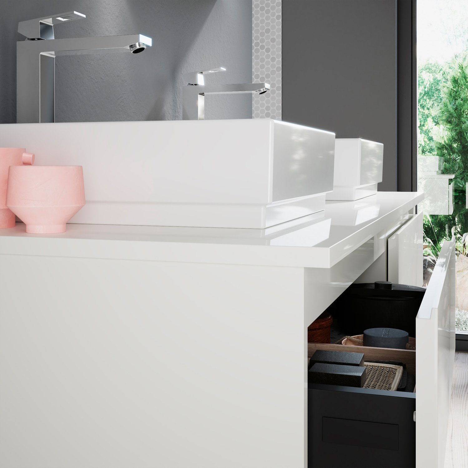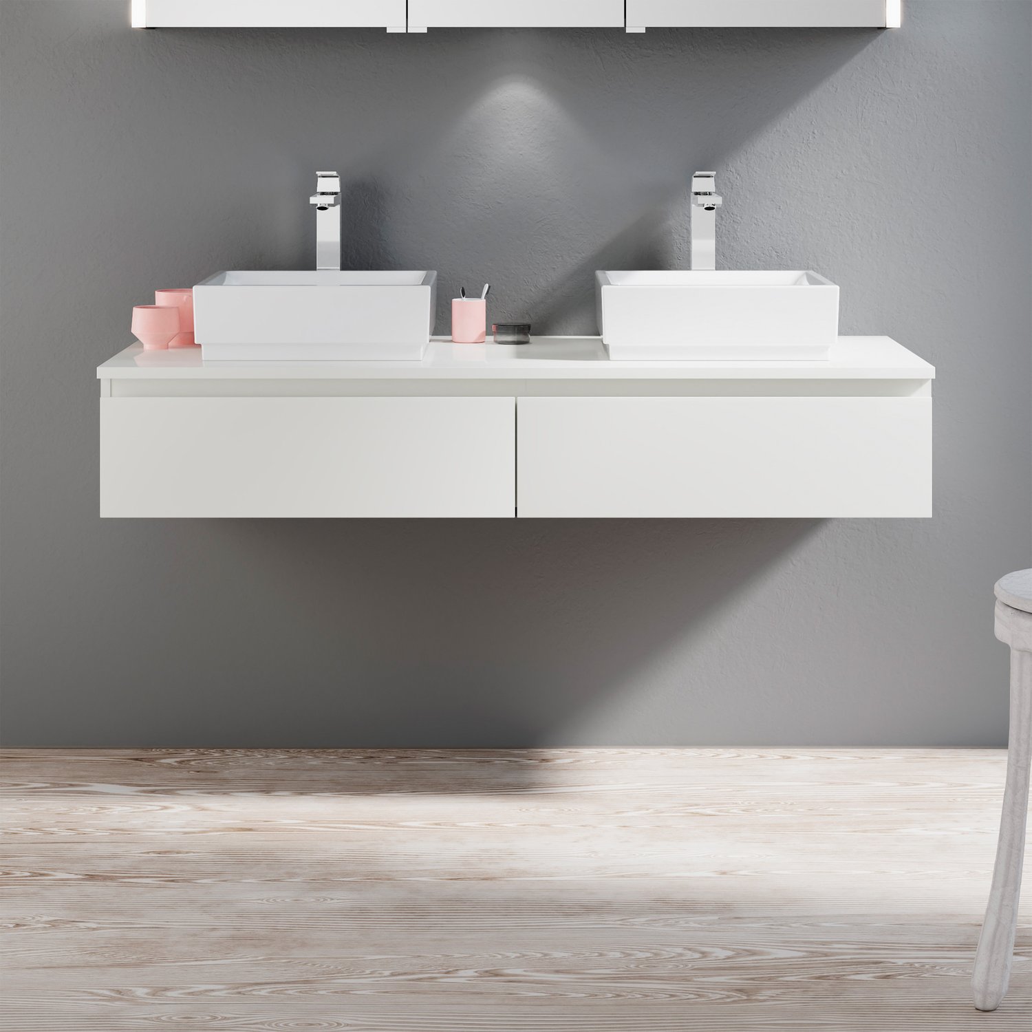 Μια εντυπωσιακή βάση επίπλου σε μια Λευκή Γυαλιστερή καθαρή άσπρη απόχρωση για να μπορεί να προσαρμοστεί σε κάθε στυλ εσωτερικής διακόσμησης και να μην σας δεσμεύει πουθενά. Ένα προϊόν με τεράστια αντοχή στις υγρασίες και στα νερά από υλικό κατασκευής πράσινο άνθυγρο υδατοαπωθητικό 18mm. Διαθέτει 2 συρτάρια με μεταλλικό σκελετό και σύστημα soft close με μεγάλο αποθηκευτικό χώρο ενώ έχει διαστάσεις 155cm (Πλάτος) x 45cm (Προβολή από τον τοίχο) x 45cm (Ύψος). Συνδυάζεται ιδανικά με επικαθήμενους νιπτήρες της επιλογής σας. Προσοχή η τιμή δεν περιλαμβάνει τους νιπτήρες, τον καθρέφτη τις μπαταρίες και τα υπόλοιπα αξεσουάρ, η τιμή αναφέρεται στην βάση του επίπλου με τα 2 συρτάρια και τον πάγκο