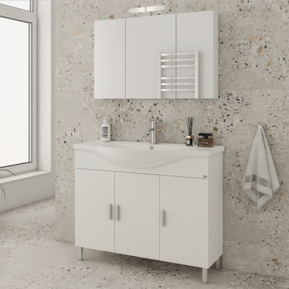 Επιδαπέδια βάση επίπλου διαστάσεων 95.5cm (πλάτος) x 80cm ( ύψος) x 34cm(προεξοχή από τον τοίχο) με 3 πόρτες και μεγάλο αποθηκευτικό χώρο σε Λευκό φινίρισμα. Διαθέτει νιπτήρα πορσελάνης άριστης κυλινδρικού σχεδιασμού σε Λευκό γυαλιστερό φινίρισμα με διαστάσεις (99.5x46x17.5cm) καθώς και καθρέφτη με 4 πόρτες και αποθηκευτικό χώρο με διαστάσεις (95.5x12x57.5cm).Μοντέρνα και διαχρονική επιλογή που ταιριάζει μοναδικά σε κάθε μπάνιο. **Προσοχή το φωτιστικό δεν συμπεριλαμβάνεται**