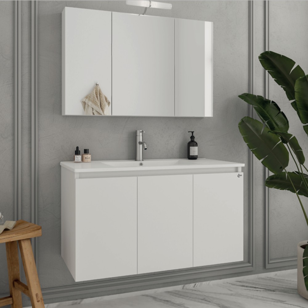Κρεμαστό Έπιπλο διαστάσεων 90cm (πλάτος) x 45cm(προεξοχή από τον τοίχο) x 50(ύψος) με 3 ανοιγόμενες πόρτες με 2 αποθηκευτικούς χώρους σε Λευκό φινίρισμα. Διαθέτει νιπτήρα πορσελάνης άριστης ποιότητας τετράγωνου μοντέρνου σχεδιασμού σε λευκό γυαλιστερό φινίρισμα με διαστάσεις (92x47x19cm) καθώς και καθρέφτη με 3 πόρτες για αποθηκευτικό χώρο με διαστάσεις (89 × 12 × 57,5 cm).Μοντέρνα και διαχρονική επιλογή που ταιριάζει μοναδικά σε κάθε μπάνιο.