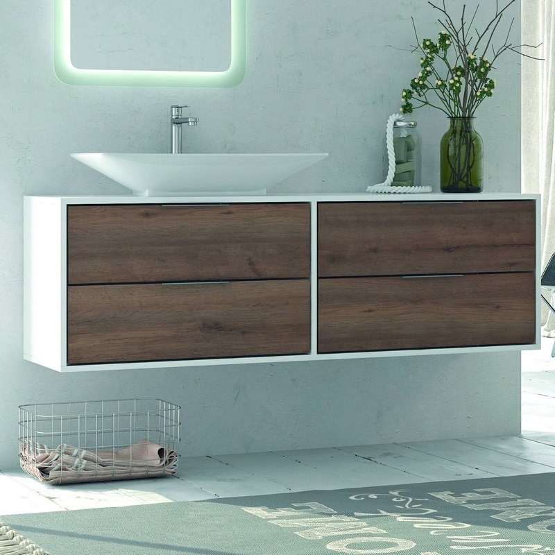 Ένα μοντέρνο κρεμαστό έπιπλο μπάνιου κατασκευασμένο σε μια μοναδική διχρωμία Καφέ ξύλου με Λευκό. Ένα προϊόν με τεράστια αντοχή στις υγρασίες και στα νερά από υλικό κατασκευής πράσινο άνθυγρο MDF υδατοαπωθητικό 18mm. Διαθέτει 4 συρτάρια με μεταλλικό σκελετό και σύστημα soft close με μεγάλο αποθηκευτικό χώρο ενώ έχει διαστάσεις 120cm (Πλάτος) x 46.5cm (Προβολή από τον τοίχο) x 48cm (Ύψος).Προσοχή!!! Η τιμή περιλαμβάνει μόνο την βάση του επίπλου μαζί με τον πάγκο χωρίς τον νιπτήρα και τα υπόλοιπα αξεσουάρ.