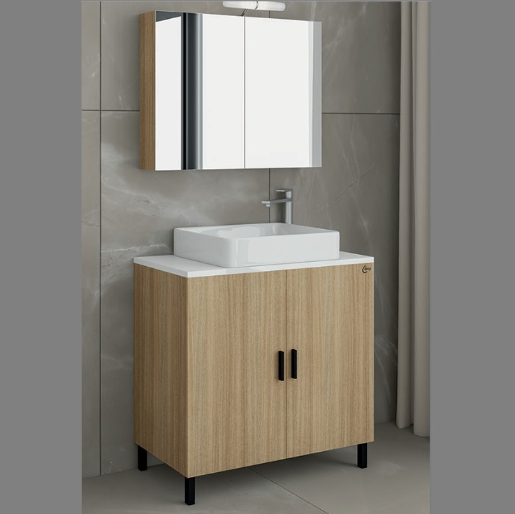 Επιδαπέδια βάση επίπλου διαστάσεων 60cm (πλάτος) x 80cm ( ύψος) x 39cm(προεξοχή από τον τοίχο) με 2 πόρτες και ενιαίο αποθηκευτικό χώρο σε Slavonia Oak φινίρισμα. Διαθέτει πάγκο από υλικό κατασκευής ξύλο θαλάσσης με διαστάσεις 61x40cm καθώς και επικαθήμενο νιπτήρα πορσελάνης άριστης ποιότητας τετράγωνου σχεδιασμού σε λευκό γυαλιστερό φινίρισμα με διαστάσεις (50x38cm) καθώς και καθρέφτη με 2 ντουλάπια με διαστάσεις (60x57.5cm).Μοντέρνα και διαχρονική επιλογή που ταιριάζει μοναδικά σε κάθε μπάνιο.