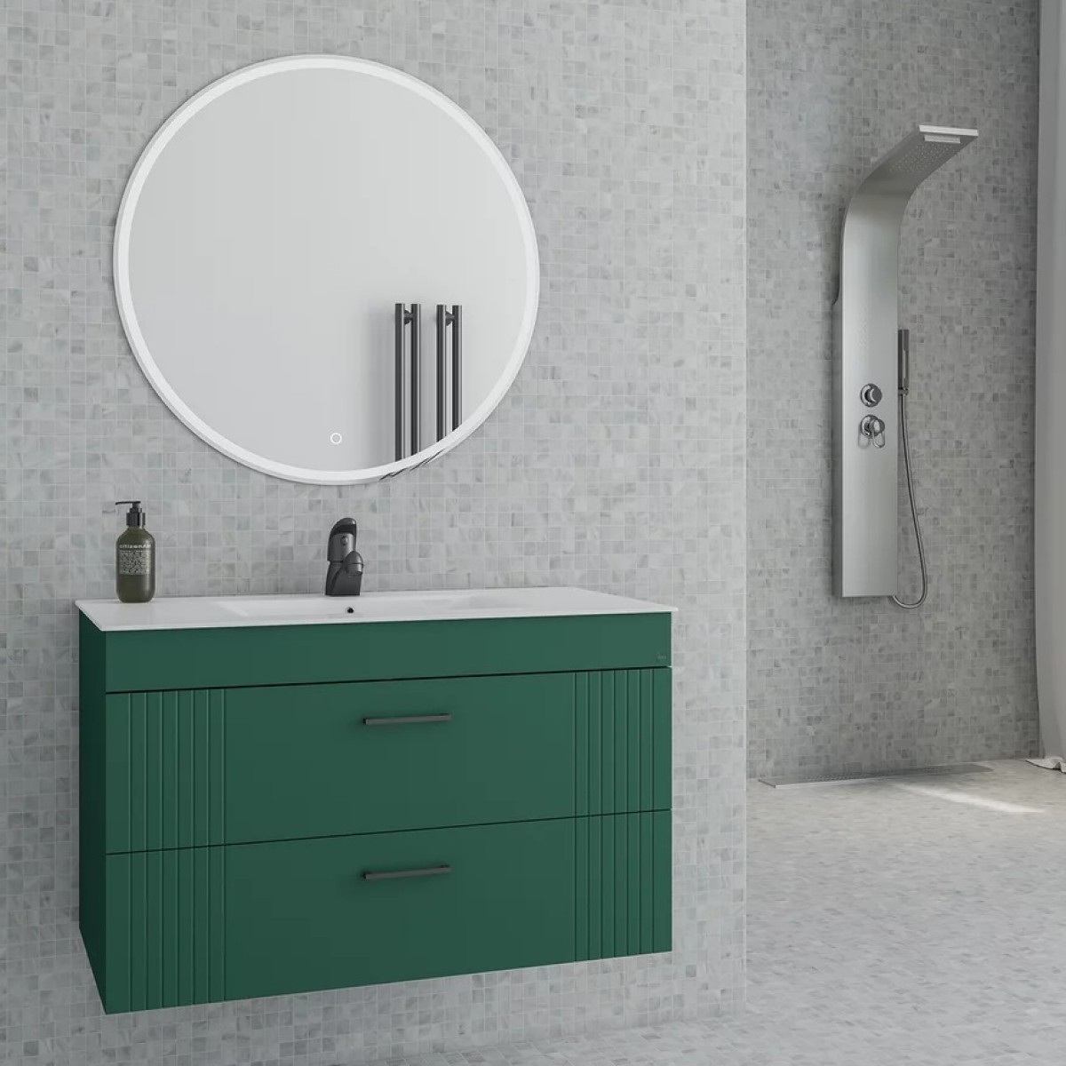 Μοναδικό εντυπωσιακό έπιπλο σε πράσινο φινίρισμα με 2 συρτάρια με ιδιαίτερη αυλακωτή λεπτομέρεια στην άκρη του ντουλαπιού για ένα απαράμιλλο design.Ένα έπιπλο που προσελκύει τα βλέμματα με τις κομψές γραμμές του αποπνέοντας πολυτέλεια και κομψότητα. Η βάση του επίπλου διαθέτει 2 συρτάρια με μεγάλο αποθηκευτικό χώρο και έχει διαστάσεις 80cm (πλάτος) x 45cm (προβολή από τον τοίχο) x 50cm (ύψος) και συνδυάζεται με κεραμικό νιπτήρα με λευκό γυαλιστερό φινίρισμα και διαστάσεις 80x46x19cm.Δυνατότητα επιλογής και Καθρέφτη για την δημιουργία του απόλυτου Σετ και κουμπί αφής και με περιμετρικό φωτισμό LED με διάσταση Φ.70cm.