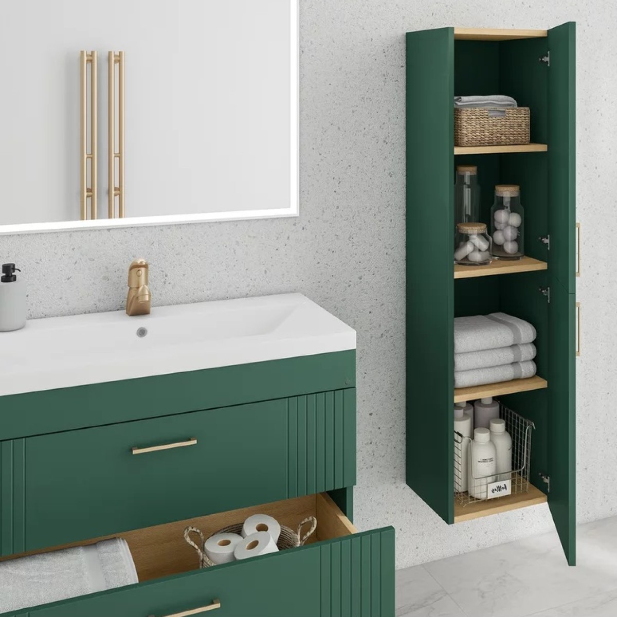 Μοναδικό εντυπωσιακό έπιπλο, ιδανικό για μικρά μπάνια με περιορισμένο χώρο, σε πράσινο φινίρισμα με 2 συρτάρια και ιδιαίτερη αυλακωτή λεπτομέρεια στην άκρη του επίπλου για ένα απαράμιλλο design.Ένα έπιπλο που προσελκύει τα βλέμματα με τις κομψές γραμμές του αποπνέοντας πολυτέλεια και κομψότητα. Η βάση του επίπλου έχει διαστάσεις 80cm (πλάτος) x 39cm (προβολή από τον τοίχο) x 50cm (ύψος) και συνδυάζεται με κεραμικό νιπτήρα με λευκό γυαλιστερό φινίρισμα και διαστάσεις 80x39x17.5cm.Προτείνεται να συνδυαστεί για επιπλέον αποθηκευτικό χώρο με Κρεμαστή Στήλη με 2 ανοιγόμενες πόρτες με διαστάσεις 30cm(πλάτος) x26cm (προβολή από τοίχο) x120cm (ύψος).Δυνατότητα επιλογής και Καθρέφτη για την δημιουργία του απόλυτου Σετ και κουμπί αφής και με περιμετρικό φωτισμό LED με διάσταση 60x80cm.