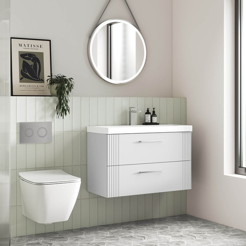 Μοναδικό εντυπωσιακό έπιπλο, ιδανικό για μικρά μπάνια με περιορισμένο χώρο, σε Λευκό Ματ φινίρισμα με 2 συρτάρια και ιδιαίτερη αυλακωτή λεπτομέρεια στην άκρη του επίπλου για ένα απαράμιλλο design.Ένα έπιπλο που προσελκύει τα βλέμματα με τις κομψές γραμμές του αποπνέοντας πολυτέλεια και κομψότητα. Η βάση του επίπλου διαθέτει 2 λαβές για να διευκολύνει το άνοιγμα του συρταριού και έχει διαστάσεις 80cm (πλάτος) x 39cm (προβολή από τον τοίχο) x 50cm (ύψος) και συνδυάζεται με κεραμικό νιπτήρα με λευκό γυαλιστερό φινίρισμα και διαστάσεις 80x39x17.5cm.Τα συρτάρια διαθέτουν μεταλλικούς μηχανισμούς soft close.Κατασκευασμένο η βάση του επίπλου από υλικό κατασκευής πράσινο ανθυγρό με τεράστια αντοχή σε φουσκώματα, νερά και υγρασίες.