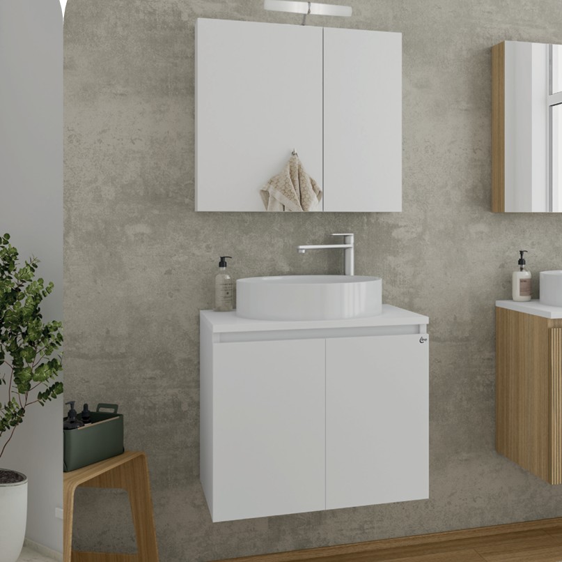 Κρεμαστό Έπιπλο διαστάσεων 60cm (πλάτος) x 45cm(προεξοχή από τον τοίχο) x 50(ύψος) με 2 ανοιγόμενες πόρτες και ενιαίο αποθηκευτικό χώρο σε Λευκό φινίρισμα. Διαθέτει λευκό πάγκο θαλάσσης με διαστάσεις 61x46cm με επικαθήμενο νιπτήρα πορσελάνης άριστης ποιότητας στρογγυλού μοντέρνου σχεδιασμού σε λευκό γυαλιστερό φινίρισμα με διαστάσεις (Φ.43x10cm) καθώς και καθρέφτη με 3 πόρτες και αποθηκευτικό χώρο με διαστάσεις (63x12x57.5cm).Μοντέρνα και διαχρονική επιλογή που ταιριάζει μοναδικά σε κάθε μπάνιο.