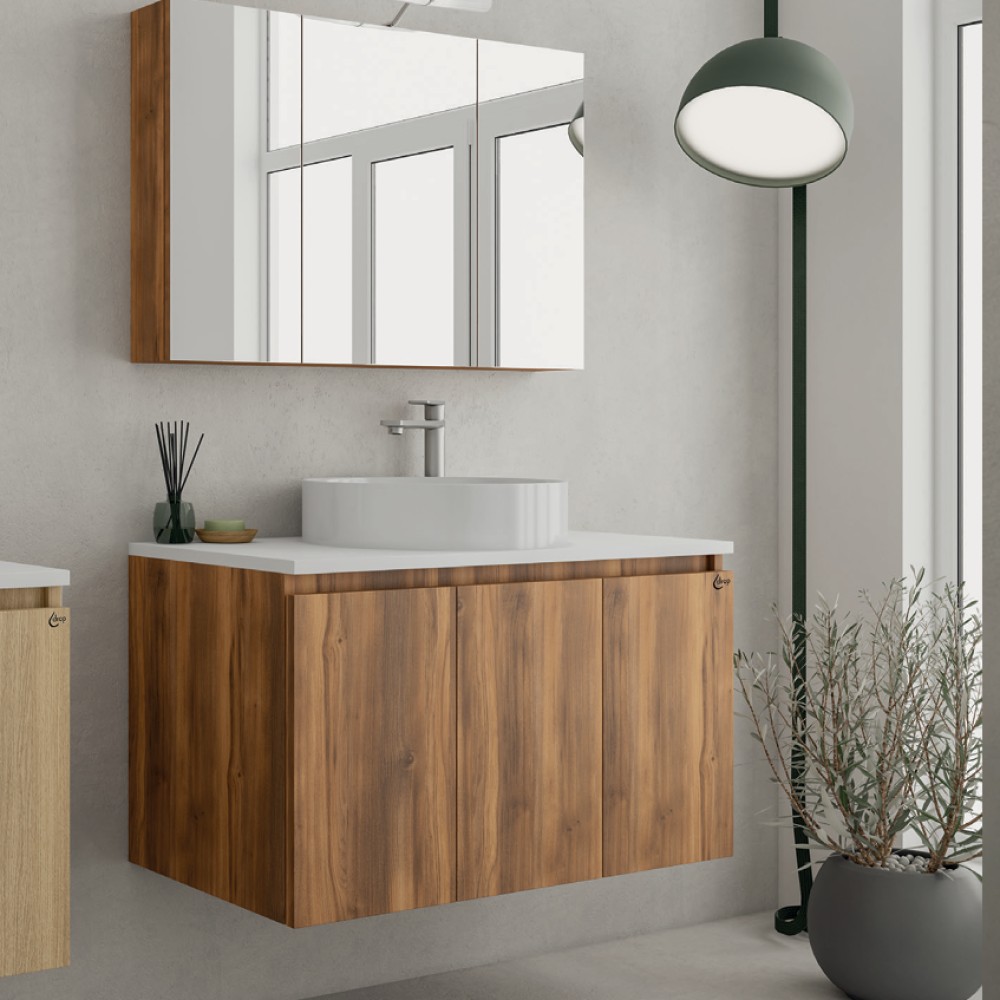 Κρεμαστό Έπιπλο διαστάσεων 90cm (πλάτος) x 45cm(προεξοχή από τον τοίχο) x 50(ύψος) με 3 ανοιγόμενες πόρτες και μεγάλο αποθηκευτικό χώρο σε Amber Baroque Oak φινίρισμα. Διαθέτει λευκό πάγκο θαλάσσης με διαστάσεις 91x46cm με επικαθήμενο νιπτήρα πορσελάνης άριστης ποιότητας στρογγυλού μοντέρνου σχεδιασμού σε λευκό γυαλιστερό φινίρισμα με διαστάσεις (Φ.43x10cm) καθώς και καθρέφτη με 3 πόρτες και αποθηκευτικό χώρο με διαστάσεις (89 × 12 × 57,5 cm).Μοντέρνα και διαχρονική επιλογή που ταιριάζει μοναδικά σε κάθε μπάνιο.