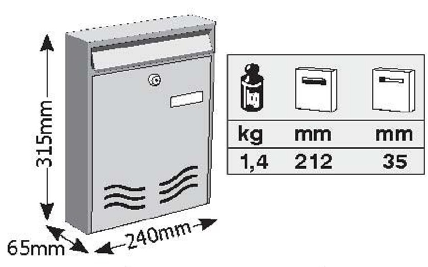 Συσκευασία: Περιλαμβάνει το γραμματοκιβώτιο μαζί με τις βίδες,τα ούπα για την προσαρμογή του στον τοίχο καθώς και την κλειδαριά ασφαλείας μαζί με το εφεδρικό κλειδί.