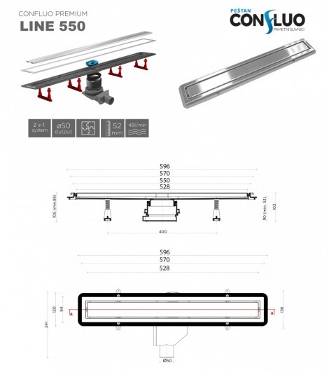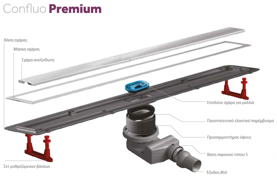 Το σιφόνι CONFLUO κατασκευάζεται από PP (πολυπροπυλένιο). Η κατασκευή του είναι ηχομονωτική καθώς το νερό κυλά αθόρυβα διά μέσω των εσωτερικών τοιχωμάτων του. Η έξοδος των 50mm είναι ρυθμιζόμενη προς όλες τις κατευθύνσεις για εύκολη και γρήγορη προσαρμογή. Παρέχει σιφωνισμό και έτσι αποτρέπει την ύπαρξη οσμών με ύψος σιφωνισμού 25mm. Διαθέτει προσαρμοστήρα ύψους καθώς και σετ στήριξης του σιφονιού στο δάπεδο, όλα ρυθμιζόμενα. Μέγιστο φορτίο 300Kg