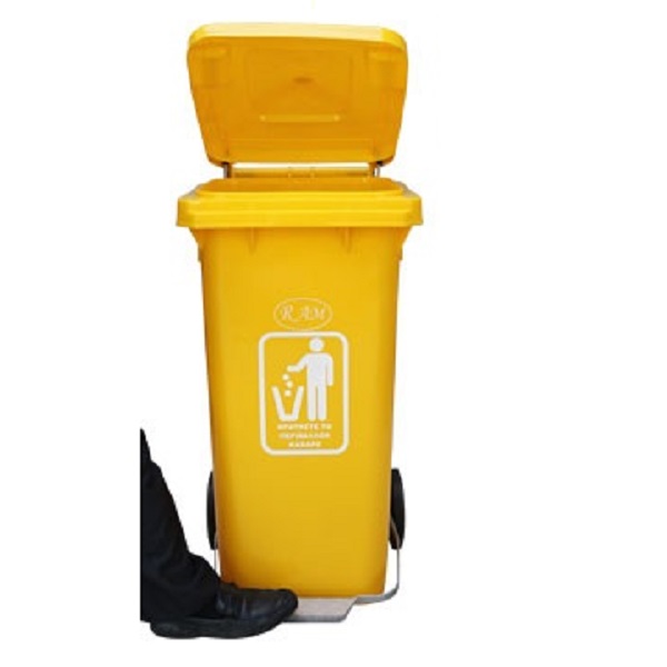Πλαστικός κάδος σκουπιδιών, με καπάκι και ρόδες χωρητικότητας 240 λίτρων με μεταλλικό πεντάλ, σε κίτρινο χρώμα.Έχει Διαστάσεις Μήκος 74cm χ Πλάτος 60cm x Ύψος 110cm.
