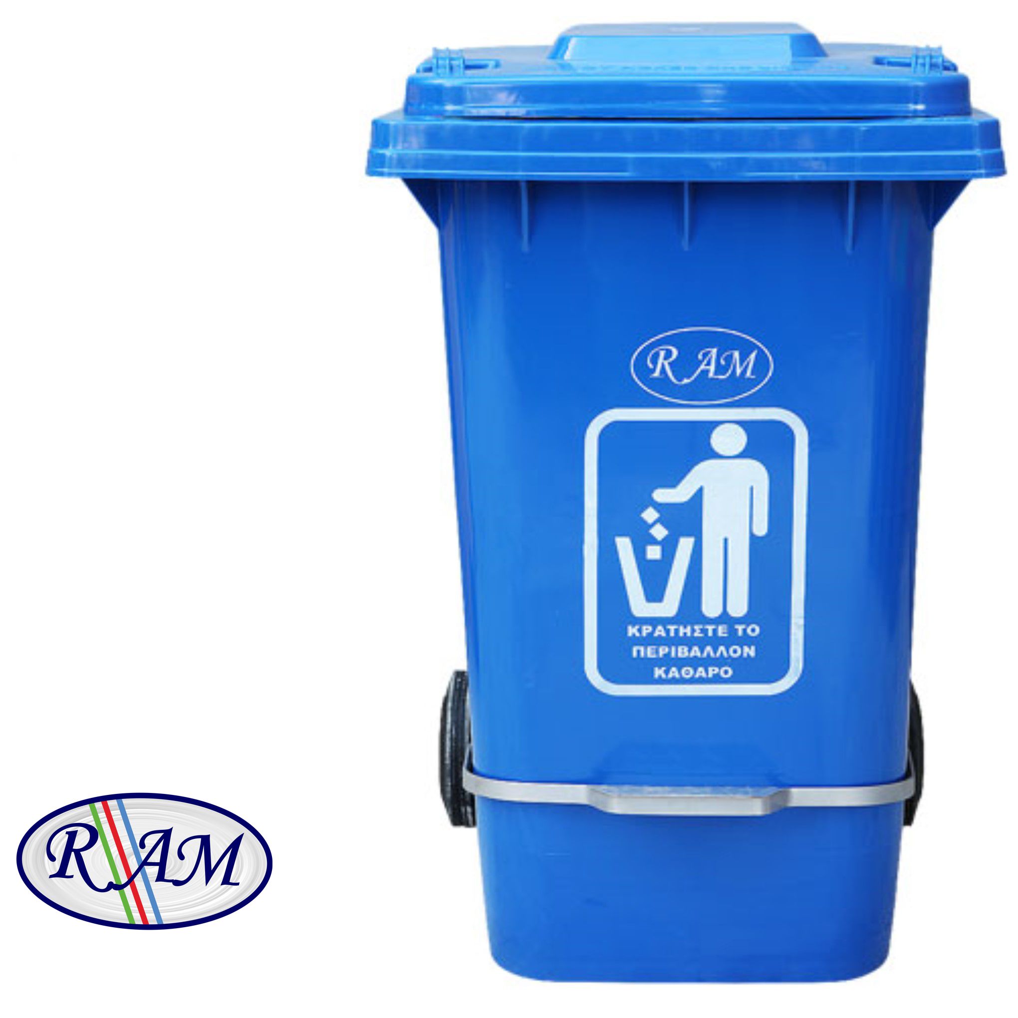 Κάδος της RAM κατασκευασμένος από υψηλής ποιότητας HDPE πλαστικό, με καπάκι, ρόδες και πεντάλ. Χρώμα: Μπλε. Χωρητικότητα: 100Ltr. Διαστάσεις: Μήκος: 47cm, Ύψος: 80cm, Πλάτος: 55cm.