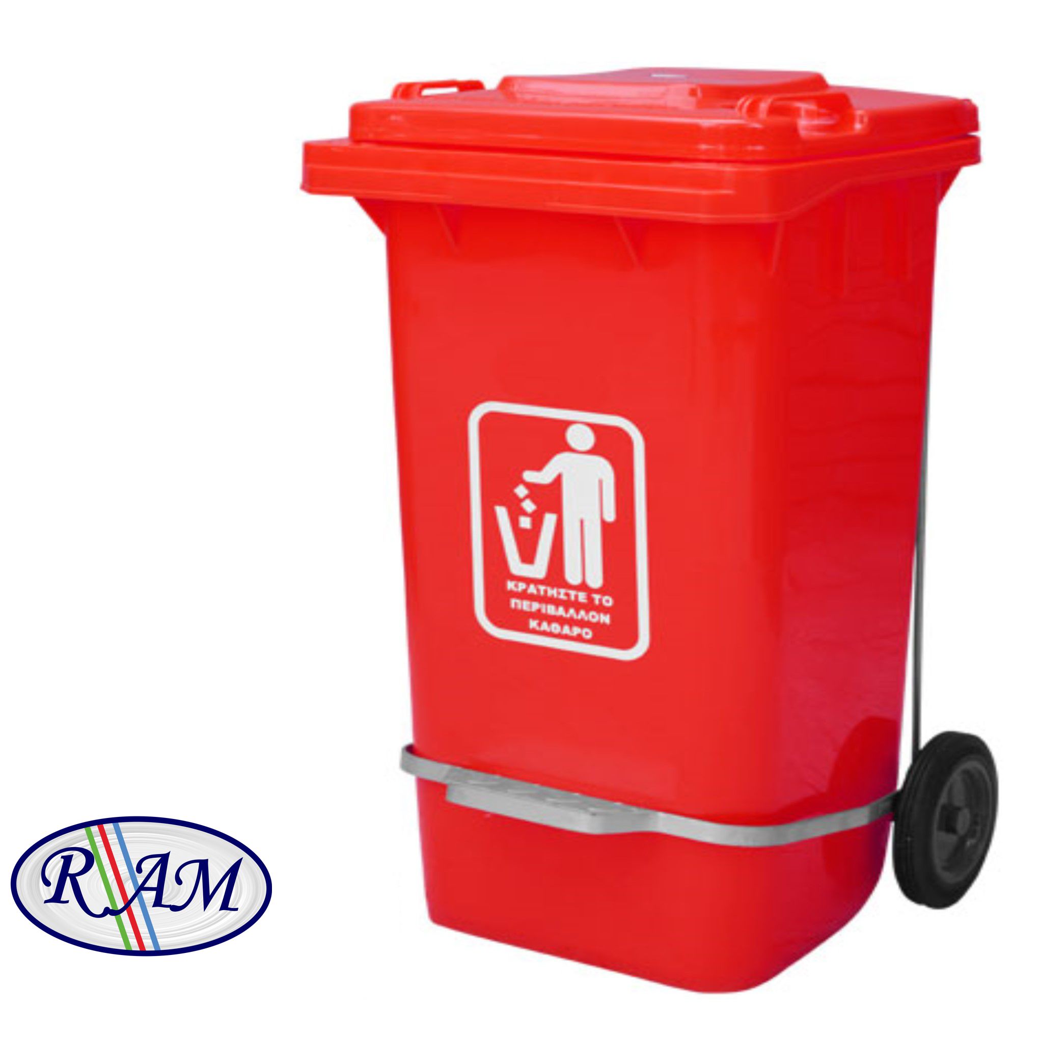Κάδος της RAM κατασκευασμένος από υψηλής ποιότητας HDPE πλαστικό, με καπάκι, ρόδες και πεντάλ. Χρώμα: Κόκκινο Χωρητικότητα: 100Ltr. Διαστάσεις: Μήκος: 47cm, Ύψος: 80cm, Πλάτος: 55cm.
