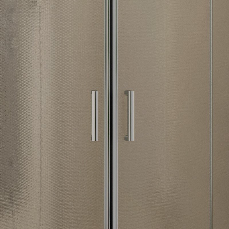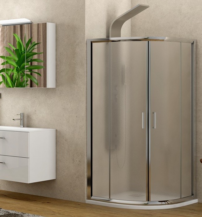 Οικονομική ημικυκλική καμπίνα ντουζιέρας με κρύσταλλα ασφαλείας 5,5 χιλιοστών. Μια καμπίνα μπάνιου άριστης ποιότητας διαθέσιμη σε 2 διαστάσεις με ύψος 180 εκατοστά. Αποτελείται από δύο σταθερές και δυο συρόμενες πόρτες, χρωμέ προφίλ ανοδιωμένου αλουμινίου και κρύσταλλα ασφαλείας, σε αμμοβολή. Επιπρόσθετα, υπάρχει δυνατότητα επιλογής για εφαρμογή Nanoskin στην εσωτερική λεία επιφάνεια της καμπίνας.