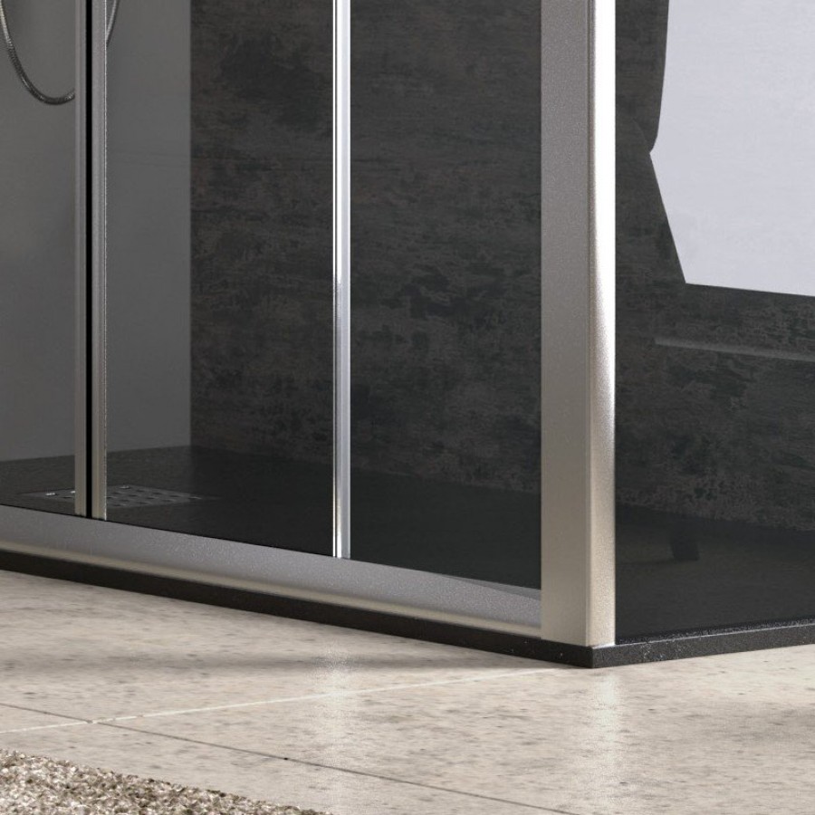 Μοντέρνα καμπίνα ντουζιέρας, κατασκευασμένα με διάφανα κρύσταλλα ασφαλείας 6 χιλιοστών, ύψους 190 εκατοστά και διαθέσιμη σε 24 επιλογές διαστάσεων. Μια καμπίνα μπάνιου άριστης ποιότητας και στιβαρής κατασκευής. Αποτελείτε από τρία σταθερά πάνελ και δύο συρόμενες πόρτες, χρωμέ προφίλ ανοδιωμένου αλουμινίου, δυο χρωμέ χερούλια, ροδάκια για τέλεια κύλιση και ειδική εφαρμογή Nanoskin στην εσωτερική λεία επιφάνεια της.