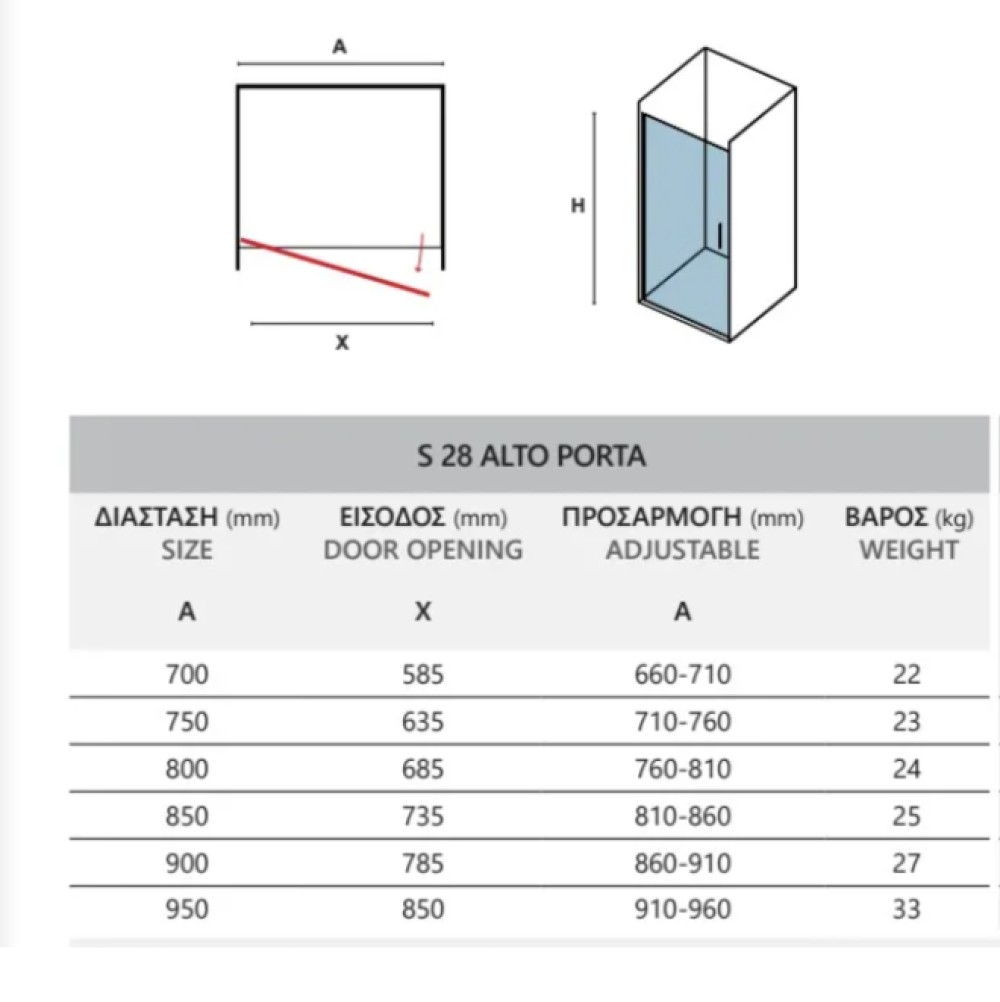 Karag S 28 Καμπίνα Ντουζιέρας Τοίχο-Τοίχο 6mm +5 Διαστάσεις 200Υ