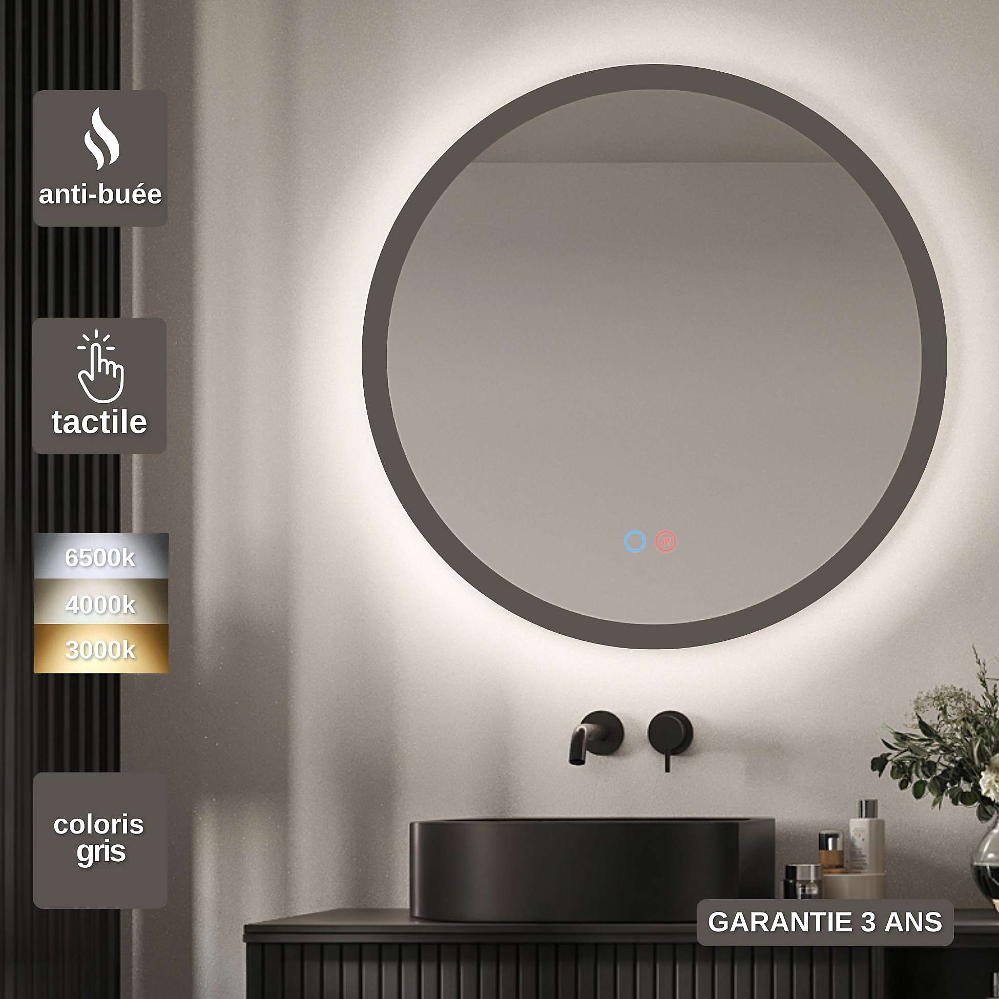 Καθρέφτης στρογγυλός (Φ.60 ή Φ.80) με Πλαίσιο Αλουμινίου σε Ανθρακί χρώμα και κρυφό φωτισμό με τρία Led (Θερμό, Φυσικό Λευκό και Ψυχρό φως) της εταιρείας IMEX. Διαθέτει διπλό αισθητήρα αντιθαμβωτικό σύστημα on/off καθώς και διακόπτη αφής Ενεργοποίησης/Απενεργοποίησης του φωτισμού . Κατασκευάζεται από αντιθραυστικό τζάμι ασφαλείας και διαθέτει LED με υψηλή χρωματική απόδοση IRC> 80, με επίστρωση σιλικόνης που προστατεύει τη λωρίδα LED, η οποία εμποδίζει την ορατότητα των διόδων εκπομπής φωτός, επιτυγχάνοντας ομοιογενές φως στο σύνολό του. Πάχος γυαλιού: 0,5mm, Ενεργειακή Κλάση F+ , 50.000 Ώρες , Ευρωπαικός Κανονισμός CE,ROHS IP44 , Ισχύς 220-240V, 50-60HZ , Kelvin 3000k/4000k/6.500k