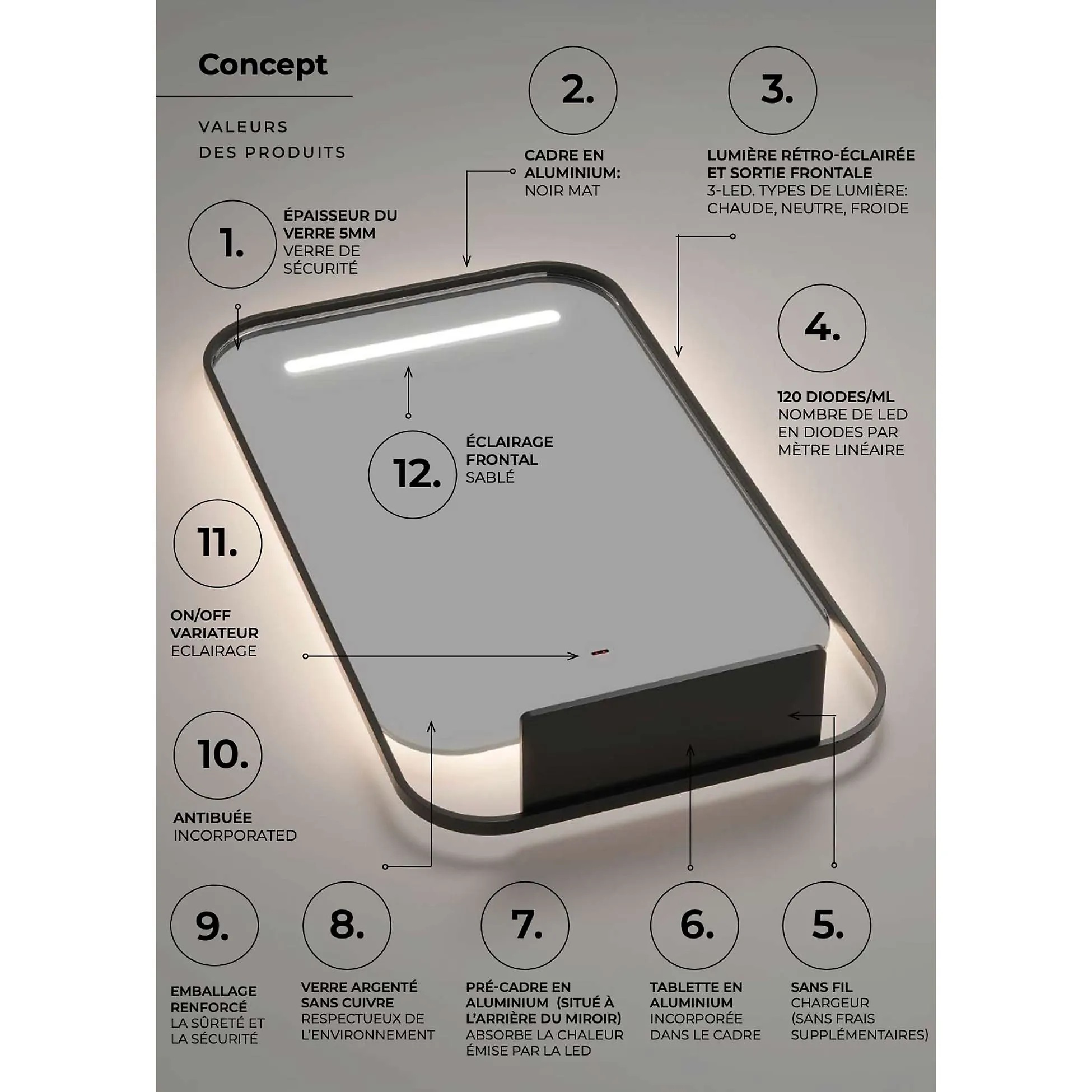 Ελέγξτε αν το ηλεκτρικό κουτί είναι καλά κρυμμένο. Τέλος αν το καλώδιο τροφοδοσίας του καθρέφτη είναι πολύ μακρύ, μπορείτε να το στερεώσετε στον τοίχο. Βεβαιωθείτε επίσης ότι το καλώδιο αυτό δεν είναι υπό τάση όταν ο καθρέφτης βρίσκεται στα στηρίγματα του.