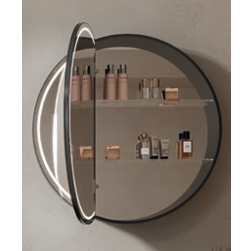 Φωτιζόμενος καθρέφτης “Led”, με ενσωματωμένο κρυφό ντουλάπι με 2 εσωτερικά ράφια, πόρτα με soft close, περιμετρικά διαθέτει μαύρο ματ πλαίσιο αλουμινίου και ενσωματωμένη πρίζα 230V. Διαθέτει επίσης Αντιθαμβωτική λειτουργία (θερμαινόμενη αντίσταση),διαθέτει Ρυθμιζόμενο χρώμα φωτισμού από θερμό 2700 έως ψυχρό 6500 το οποίο αλλάζει πατώντας παρατεταμένα το Διακόπτης αφής. Διαθέτει Πρίζα 230V, 55W με 1738 Lumen, Φωτισμό εμπρός/ πίσω LED 60W, Προστασία: IP44,Ενεργειακή κλάση Α. Διατίθεται σε διάσταση φ.70cm.Ο καθρέφτης δεν διαθέτει χαλκό γεγονός που τον καθιστά 3 φορές με μεγαλύτερη αντοχή στην φθορά και στην οξείδωση.