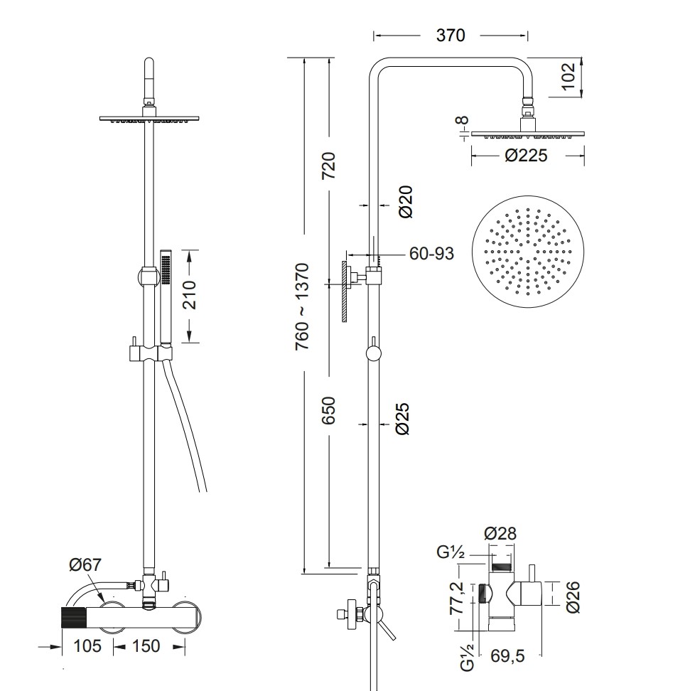 Στήλη ντουζ 2 εξόδων με μπαταρία από την ιταλική εταιρία Eurorama σε Μπρονζέ Παλαιωμένο φινίρισμα. Ανακλινόμενη κεφαλή ντους anticalcare (κατά των αλάτων) φ.22.5 εκ. Τηλέφωνο anticalcare με στήριγμα και άθραυστο σπιράλ 1,5 μ. Ρυθμιζόμενο ύψος 76 – 137 εκ. Κατασκευάζεται από 100% ορείχαλκο χωρίς προσμίξεις με μόλυβδο. Περλάτορας κατά των αλάτων, χαμηλού θορύβου και μεγάλης αντοχής σε υψηλή πίεση και Κεραμικός μηχανισμός ιδανικός για εξοικονόμηση νερού.