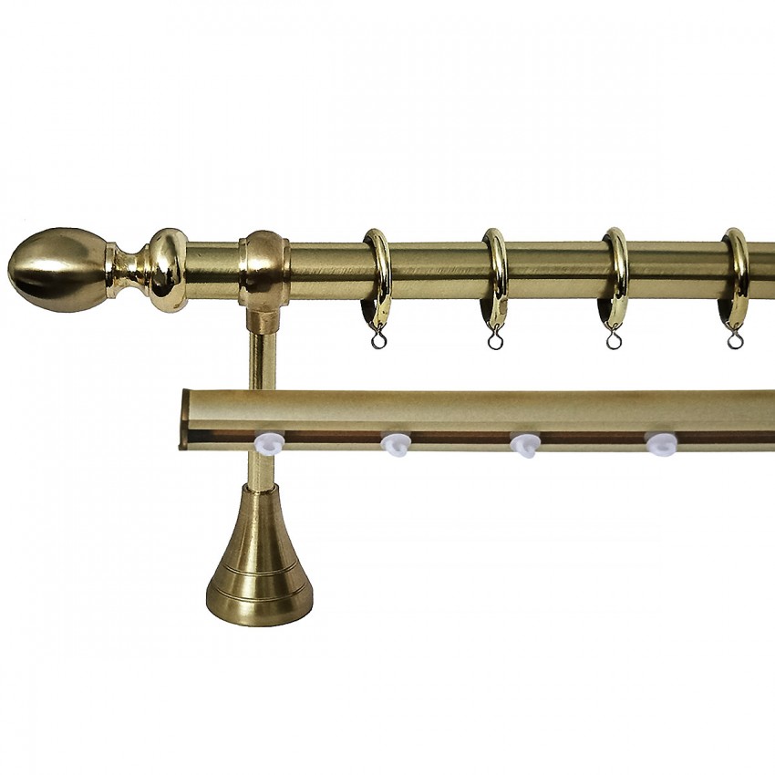 Απλή και απέριττη σειρά με πάχος σωλήνα Φ.25 και διακοσμητικά στρογγυλά δίχρωμα άκρα σε απόχρωση Χρυσό ματ με Χρυσό Γυαλιστερό. Καταπληκτικό design που θα αναβαθμίσει τον εσωτερικό σας χώρο προσθέτοντας του μια απαράμιλλη κομψότητα αναδεικνύοντας και την παραμικρή λεπτομέρεια του. Διαθέσιμο σε διάφορες διαστάσεις (1.40m μέχρι 3.00m).Για Διπλές κουρτίνες διατίθεται και σε διπλό με εσωτερικό σιδηρόδρομο αλουμινίου, αλλά και σε διπλό με εσωτερικό σωλήνα Φ.20.Προσαρμόζεται και στις δικές σας διαστάσεις και κόβεται στα μέτρα σας κατόπιν παραγγελίας.