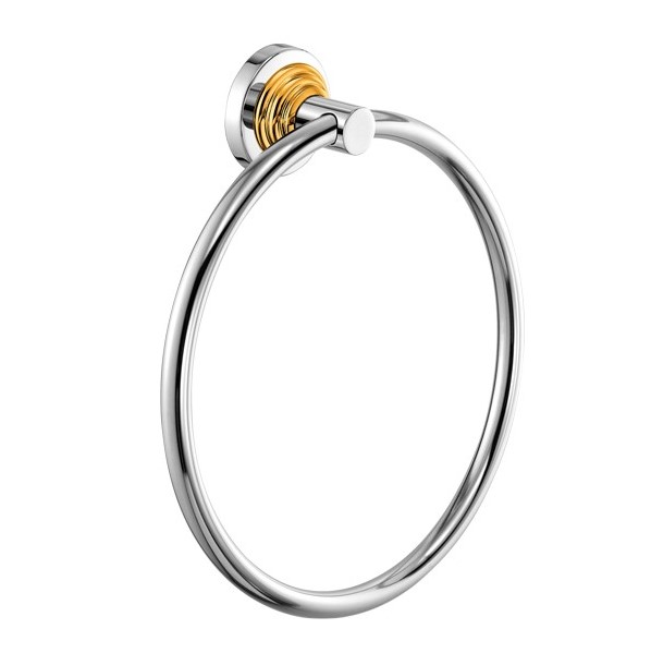Κρίκος για πετσέτες μπάνιου πολυτελείας ιδιαιτέρως εύχρηστος και βολικός, κατασκευασμένος εξ ολοκλήρου από ατόφιο επιχρυσωμένο ορείχαλκο υλικό κατασκευής σε Χρωμέ φινίρισμα διχρωμία με Χρυσό φινίρισμα 24 Καρατίων. Μια σειρά για τους λάτρεις της διαχρονικής κομψότητας. Οι καμπύλες και οι λιτές ευθείες συνυπάρχουν αρμονικά, δημιουργώντας έναν συνολικά διακριτικό σχεδιασμό. Έχει Διαστάσεις 20.5cm x 5cm x 22.5cm.