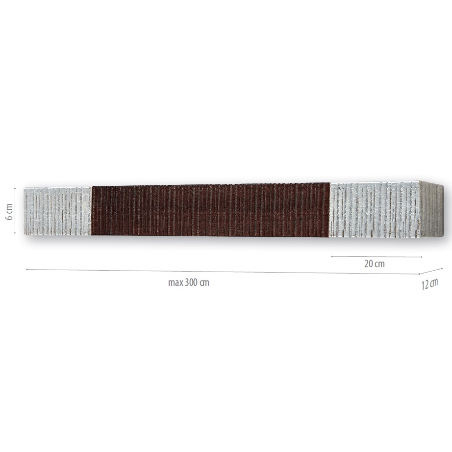 Ξύλινη μετόπη για κουρτίνες σε Καφέ με Ασημί φινίρισμα.Κατασκευάζεται σε οποιαδήποτε διάσταση επιθυμείτε κατόπιν παραγγελίας και κόβεται στα μέτρα σας.Στην τιμή συμπεριλαμβάνεται και σιδηρόδρομος 4.5cm.Έχει Πλάτος: 6cm και Φάρδος: 12cm.