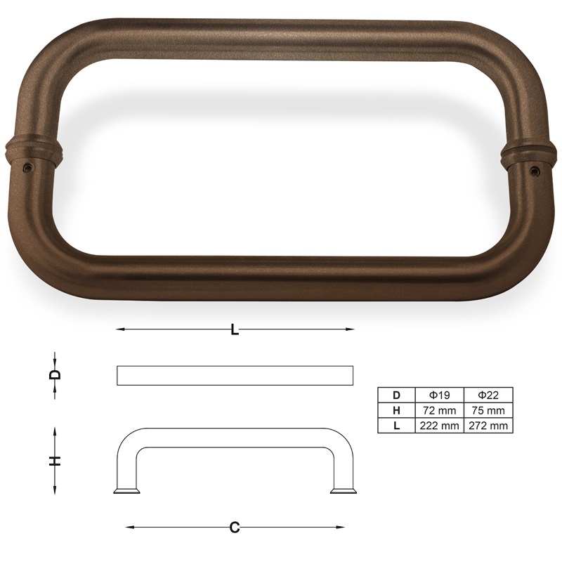 Κυλινδρικό design που ταιριάζει ιδανικά σε κάθε πόρτα. Ιδανική περίπτωση για γυάλινες πόρτες.Κατασκευασμένη εξ'ολοκλήρου από Ανοξείδωτο Ατσάλι. ηλεκτροστατικά βαμμένο σε Αντικέ Σκουριά.Έχει πάχος Φ.22,Ολικό Μήκος 27.5cm, Κέντρα Βίδας 25cm και Βάθος 7.5cm.Διατίθεται σε Ζευγάρι (2 τεμάχια).