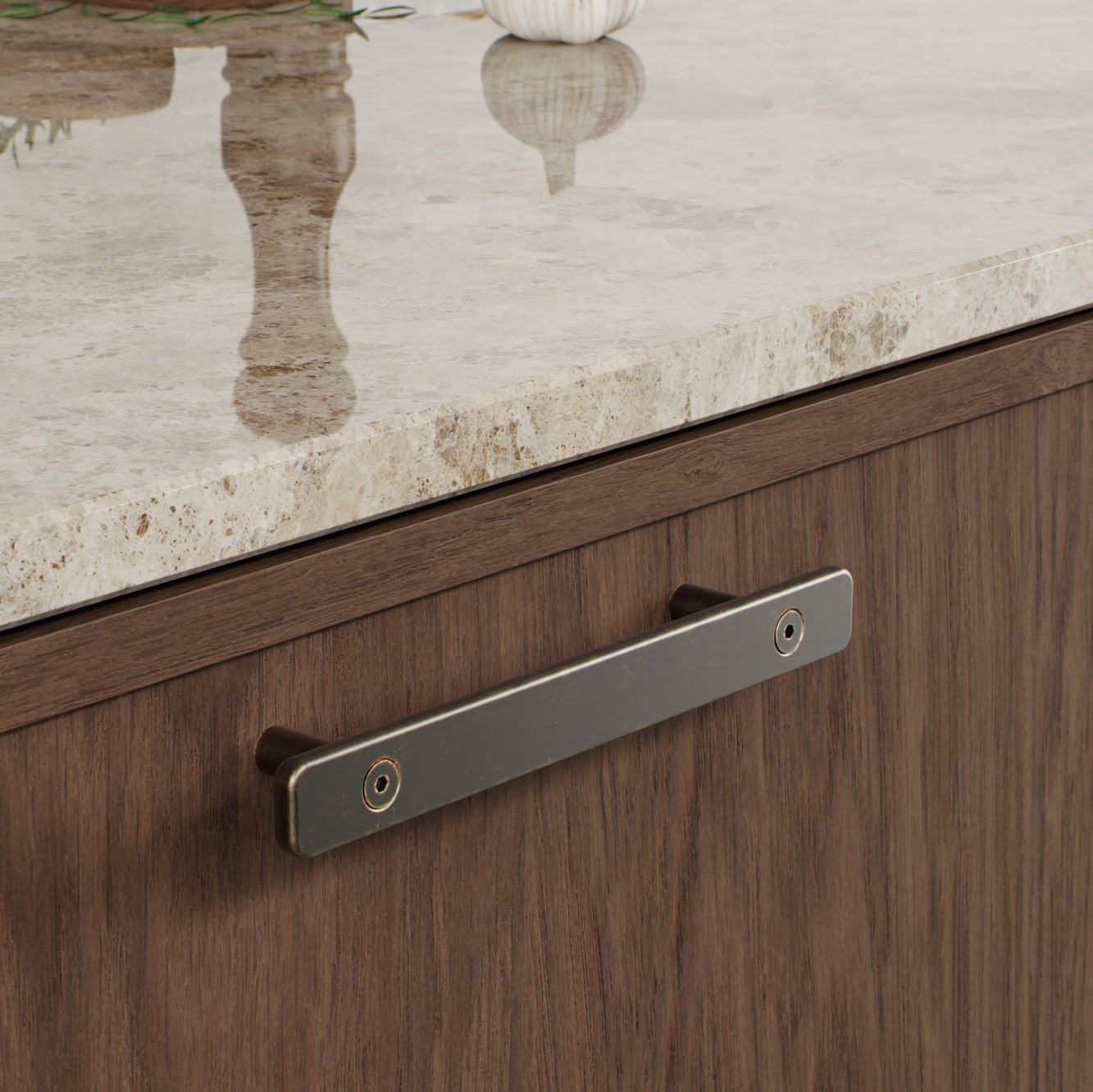 Μια λαβή που αποπνέει μια ακατέργαστη και βιομηχανική έκφραση, προσθέτοντας χαρακτήρα σε κάθε χώρο. Το εργαλείο ορίζεται από τα βιομηχανικά μπουλόνια που φαίνεται να συγκρατούν τη λαβή, κάτι που ξυπνά αναμνήσεις από περασμένες εποχές και πραγματικά χρήσιμα εξαρτήματα επίπλων. Ο σχεδιασμός είναι προσεκτικά συντονισμένος με έμφαση στη λειτουργικότητα, ενώ η στρογγυλεμένη πλάτη εξασφαλίζει μια άνετη και εργονομική λαβή. Διαθέσιμο σε Κέντρα βίδας 12.8cm με Ολικό Μήκος 17.6cm.